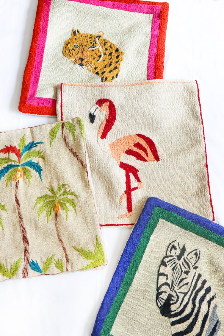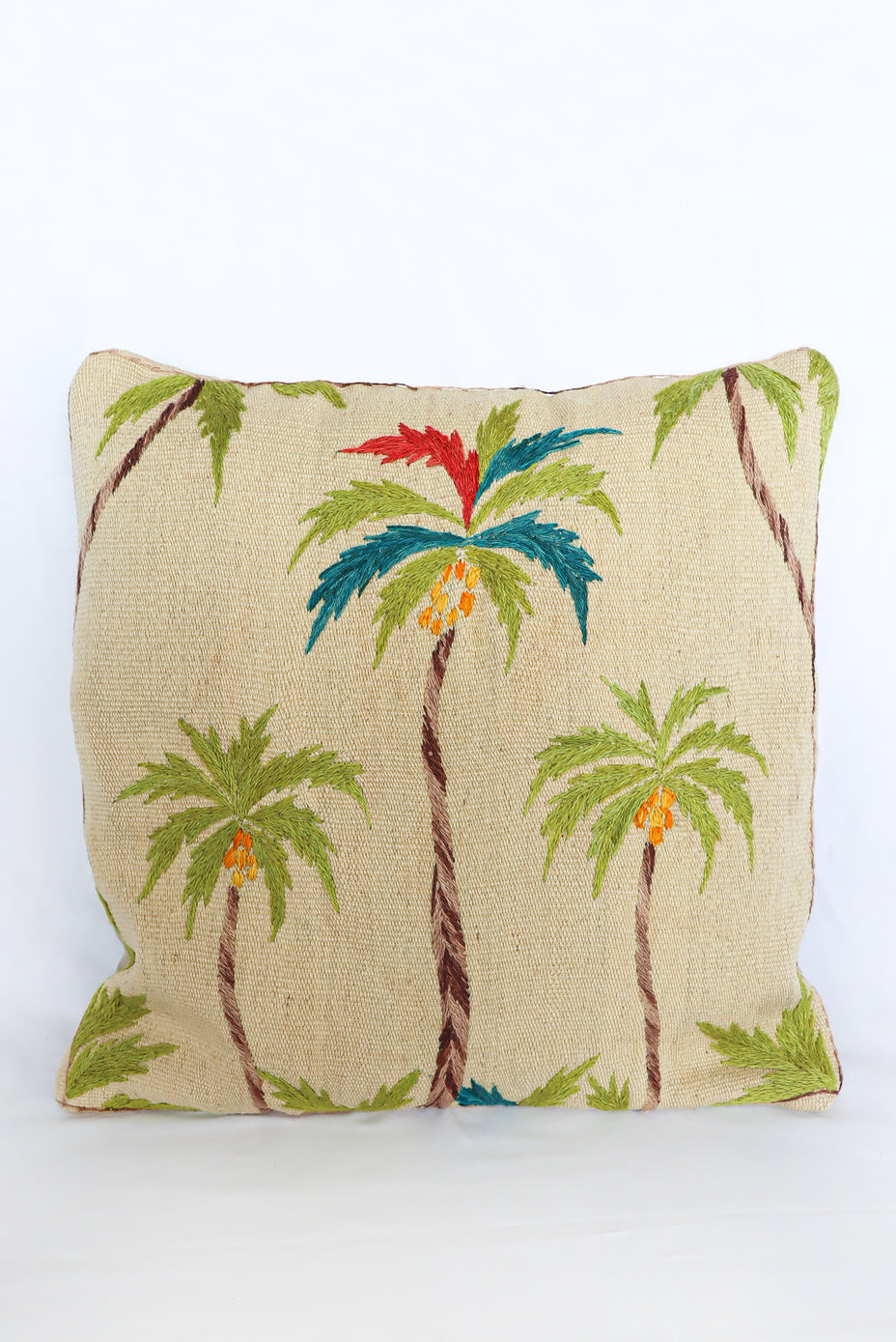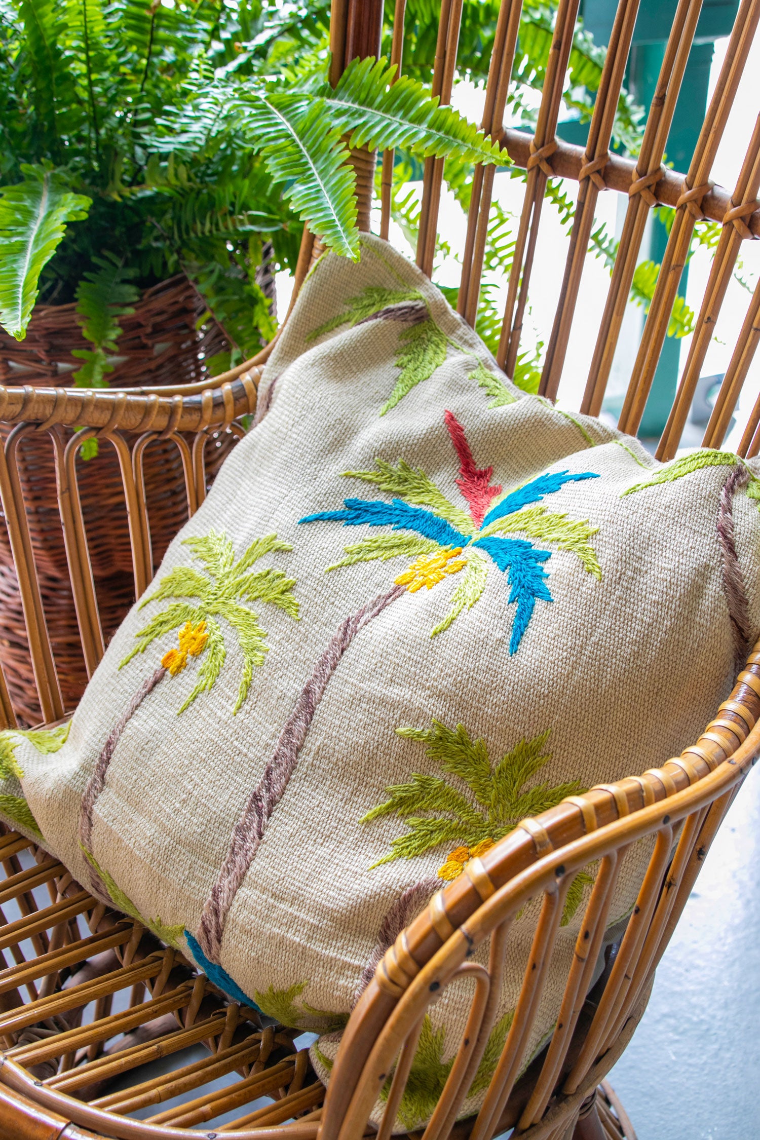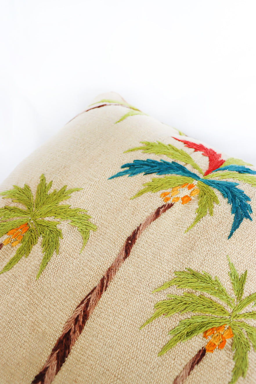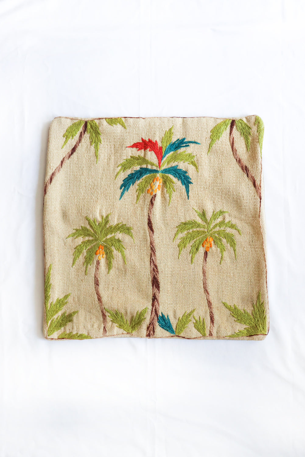 Funda de almohadón bordado a mano con diseño de palmeras.