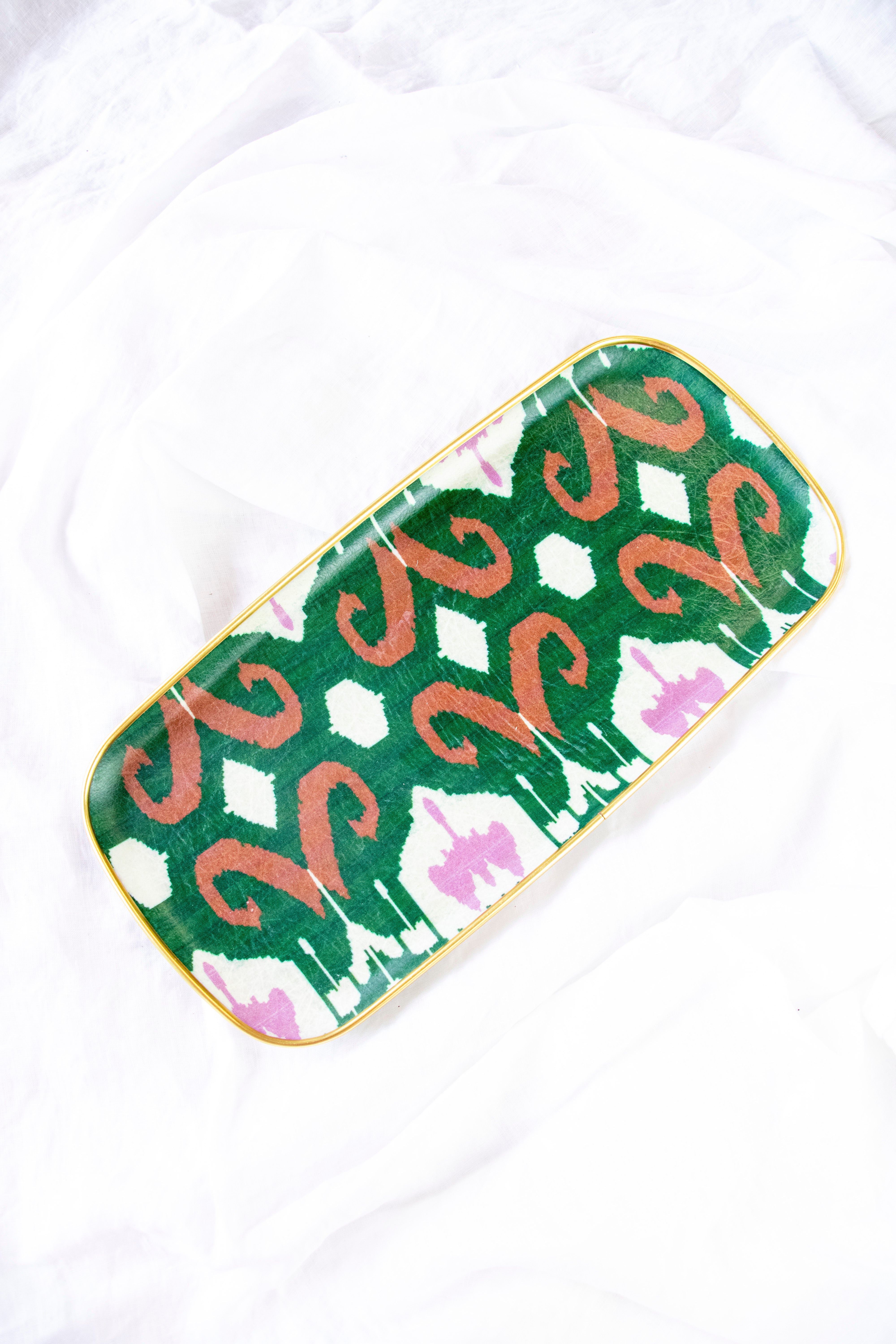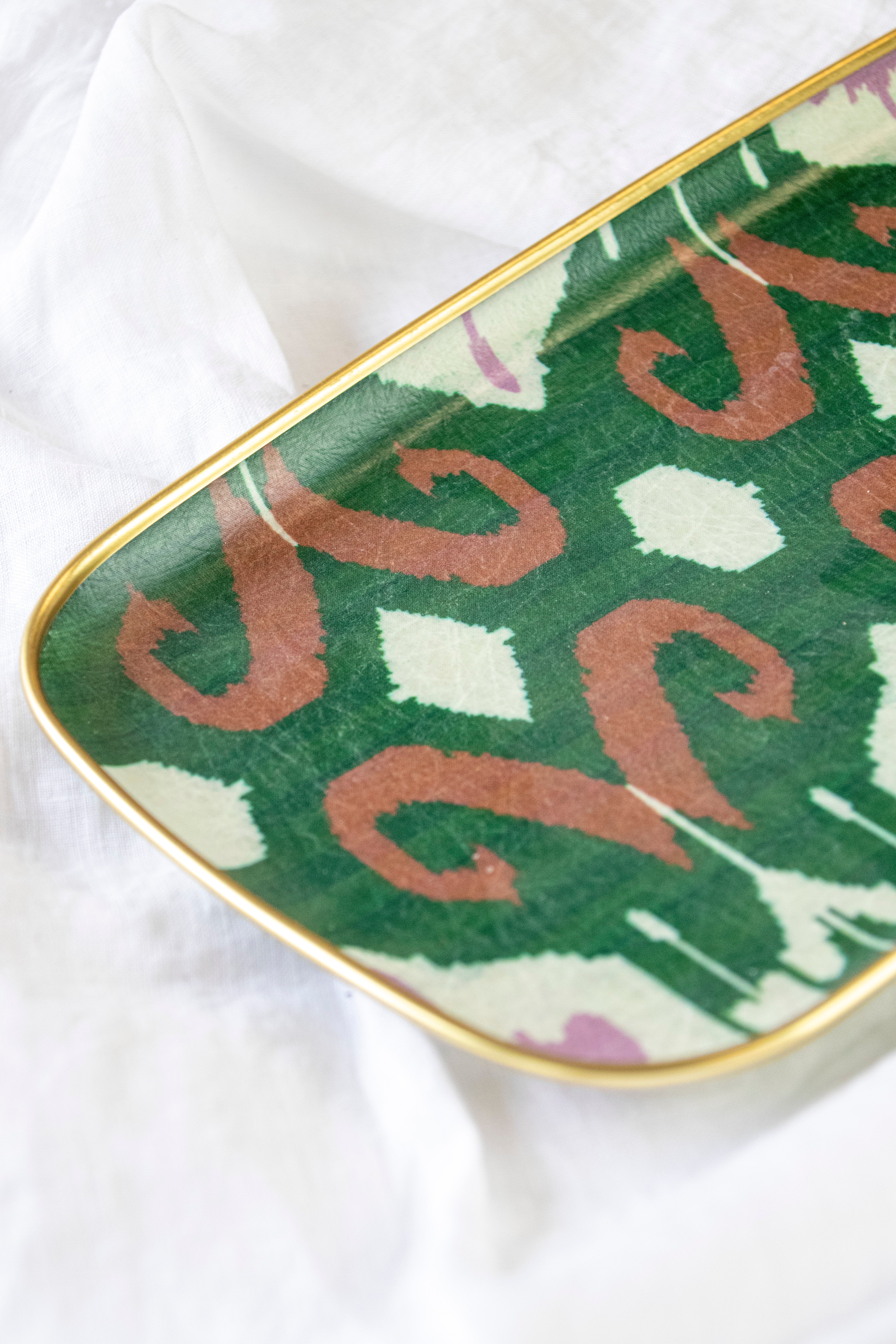 Bandeja rectangular con filo dorado. Al coger trozos de tela ikat y sumergirlos en resina se obtienen estas preciosas bandejas que aunque imperfectas, están hechas a mano, te conquistarán por su gracia y sus colores.