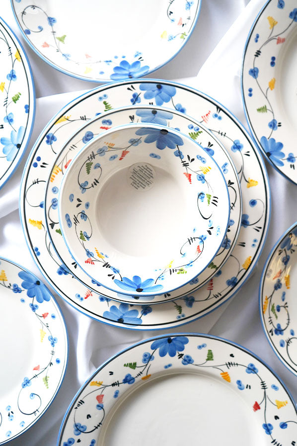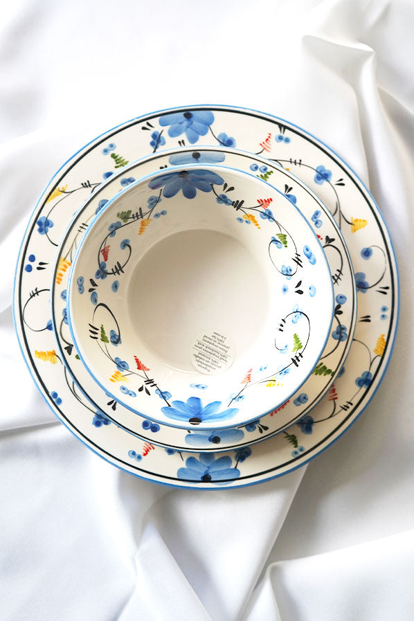 Bowl pintado a mano con motivos florales acompañado con unas elegantes líneas finas. Borde pintado en color azul.