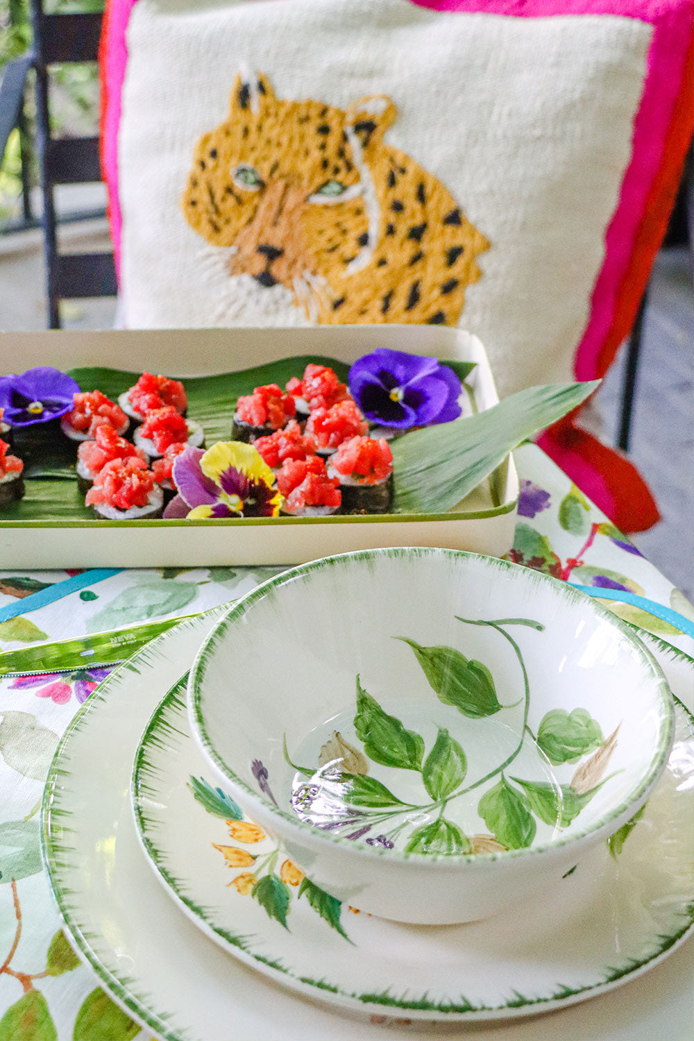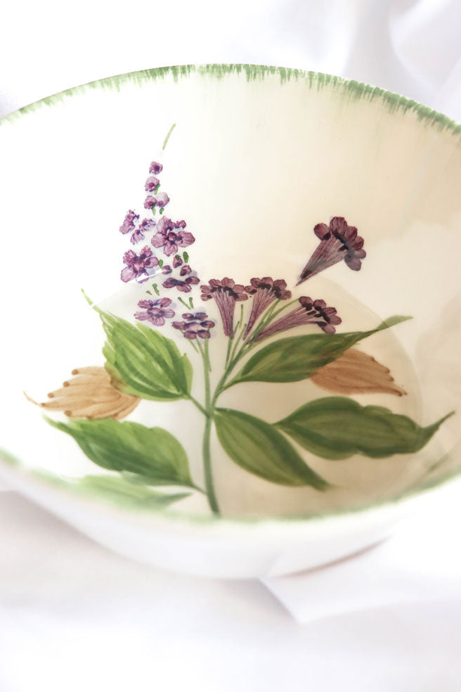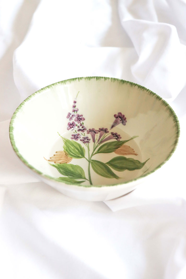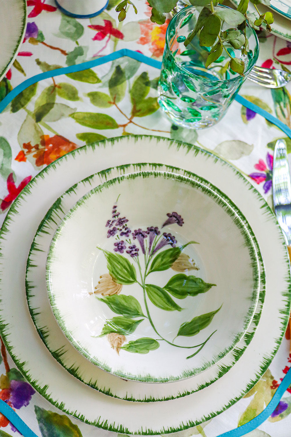 Bowl pintado a mano con dibujo central de lavanda y borde verde irregular. Toda la colección botánica está pintada a mano y por ello su forma y color pueden variar de una pieza a otra, haciendo a cada una de ellas única.