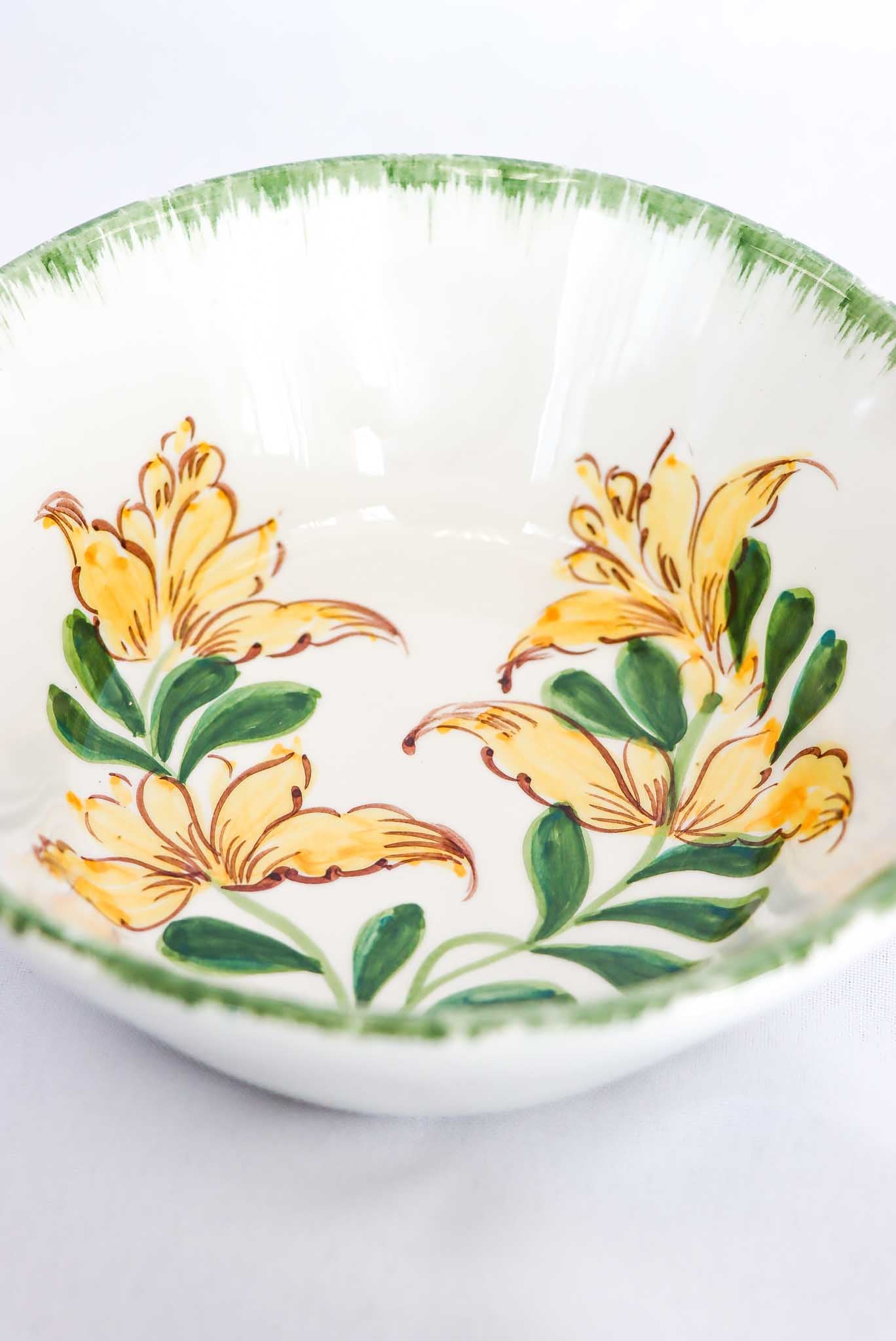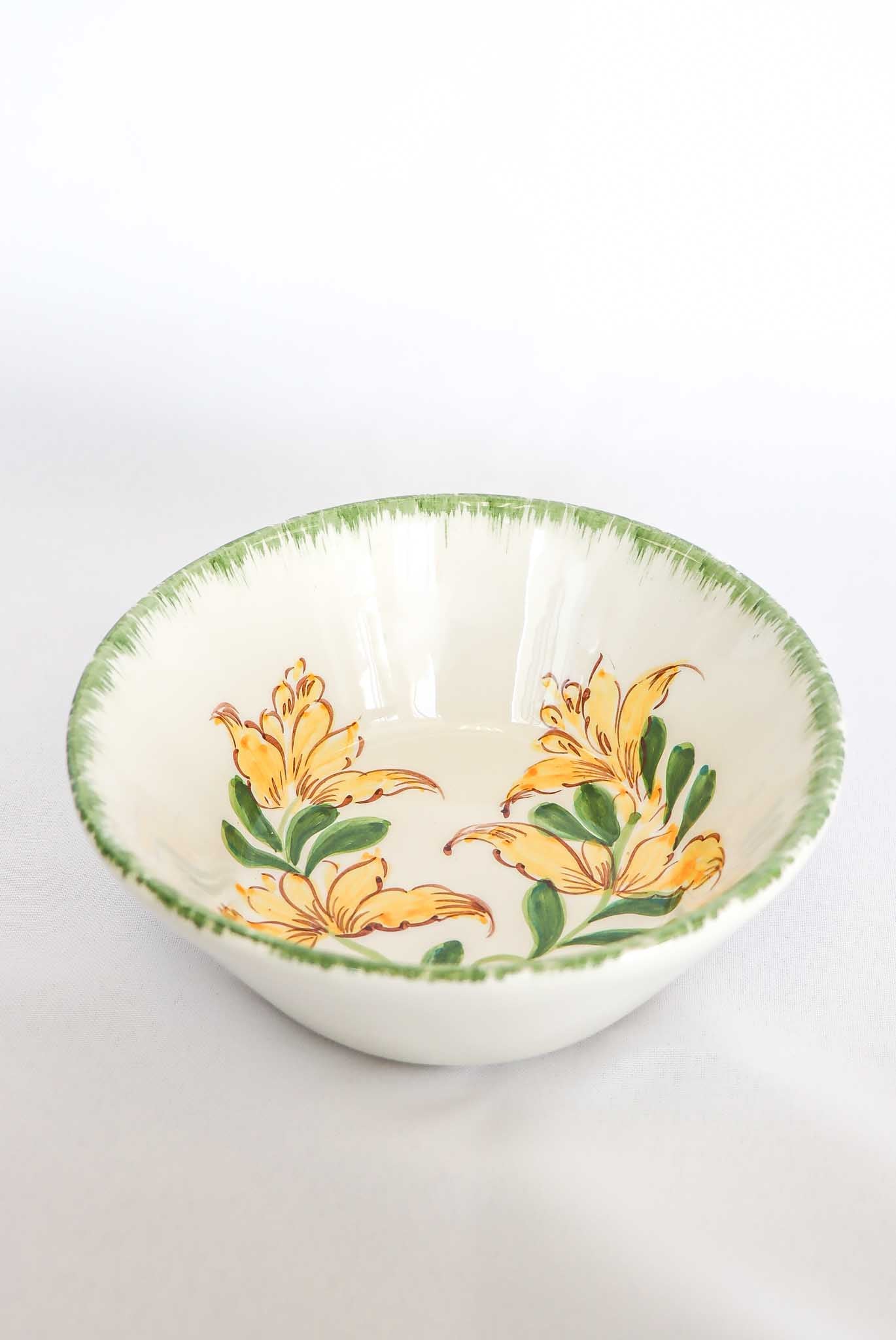 Bowl pintado a mano con dibujo central de retama y borde verde irregular. Toda la colección botánica está pintada a mano y por ello su forma y color pueden variar de una pieza a otra, haciendo a cada una de ellas única.