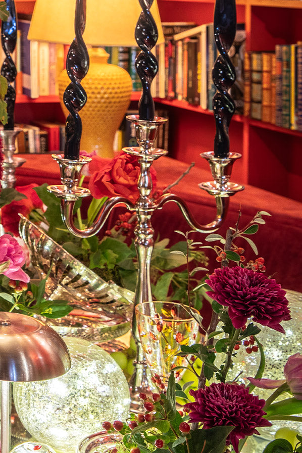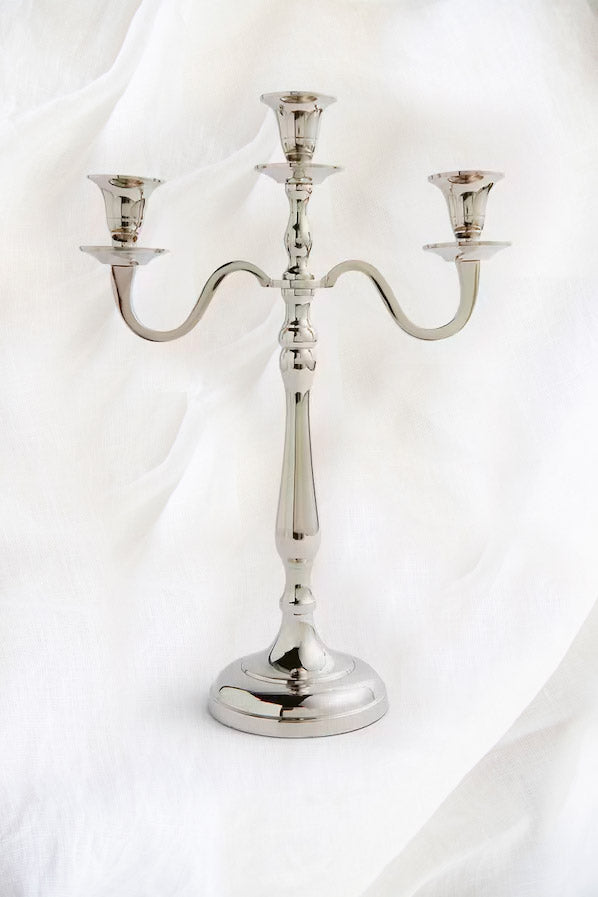 Candelabro de aluminio de 3 brazos de diseño elegante en color plateado. Cuenta con una base estable perfecta para colocar una vela tradicional de diámetro máximo de 2 cm.