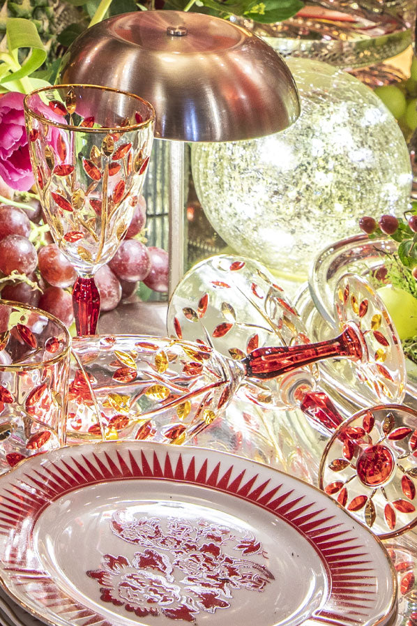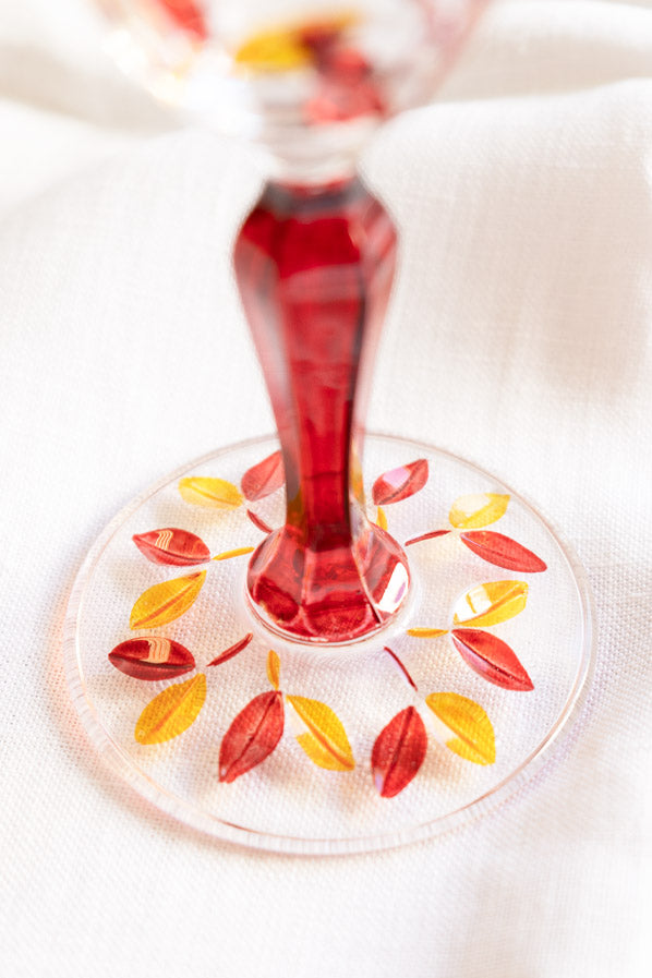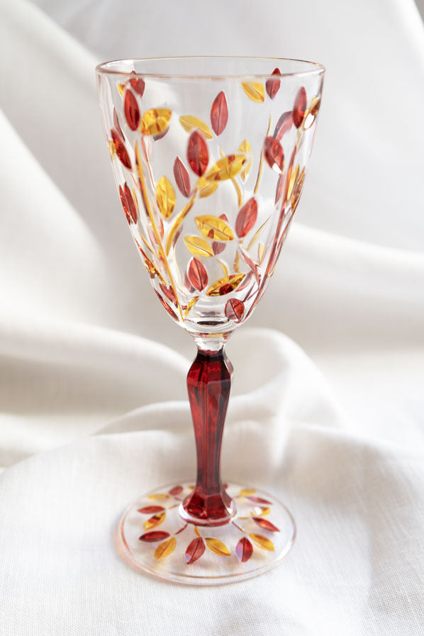 Copa tallada con decoración hojas en tonos rojos y naranjas. Hecho artesanalmente en Italia.