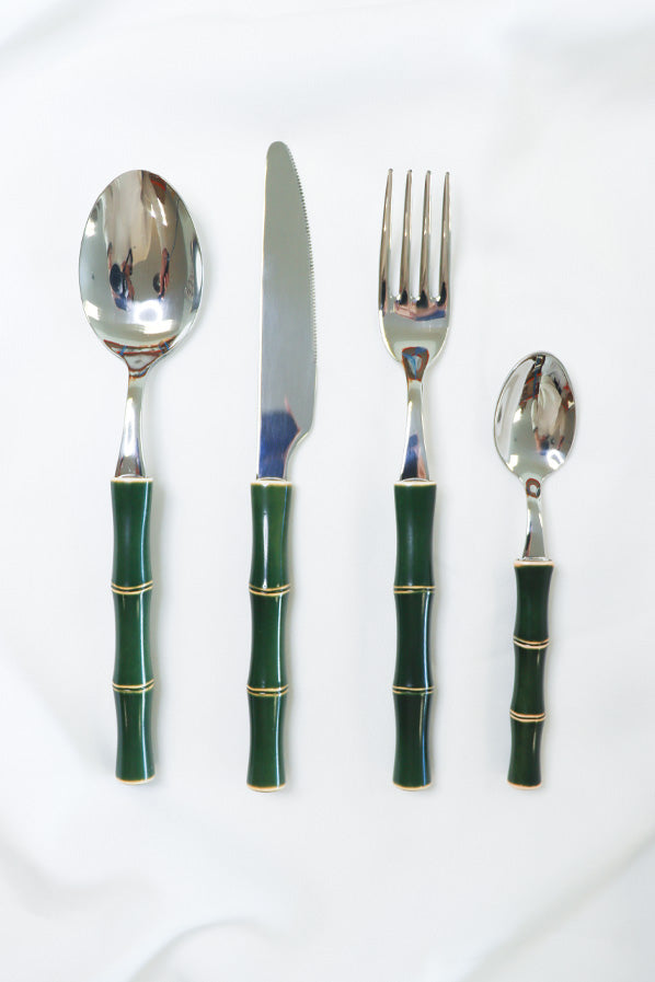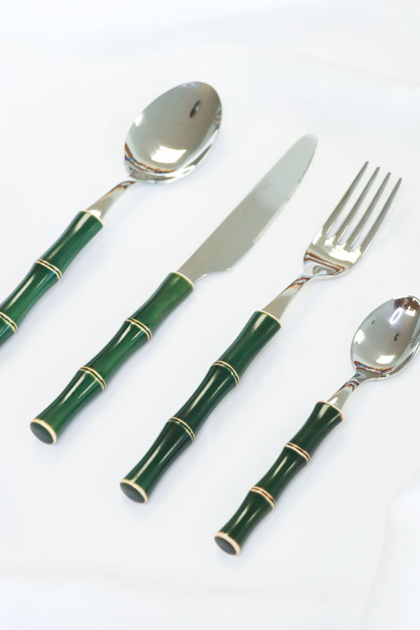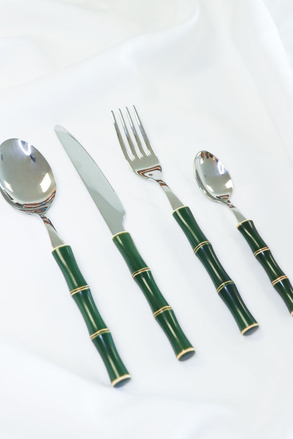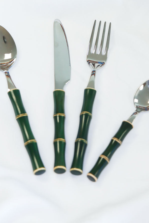 Cubiertos de acero inoxidable con mango aclírico en forma de bambú de color verde.