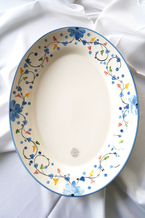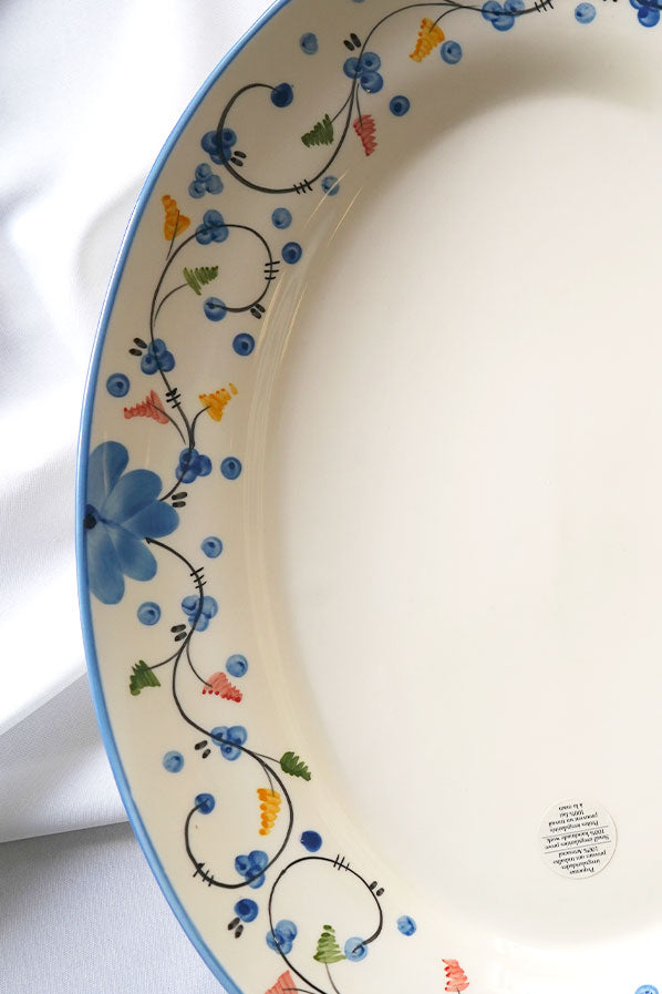 Fuente pintada a mano con motivos florales acompañado con unas elegantes líneas finas. Borde pintado en color azul.