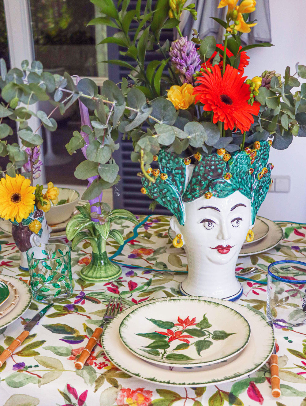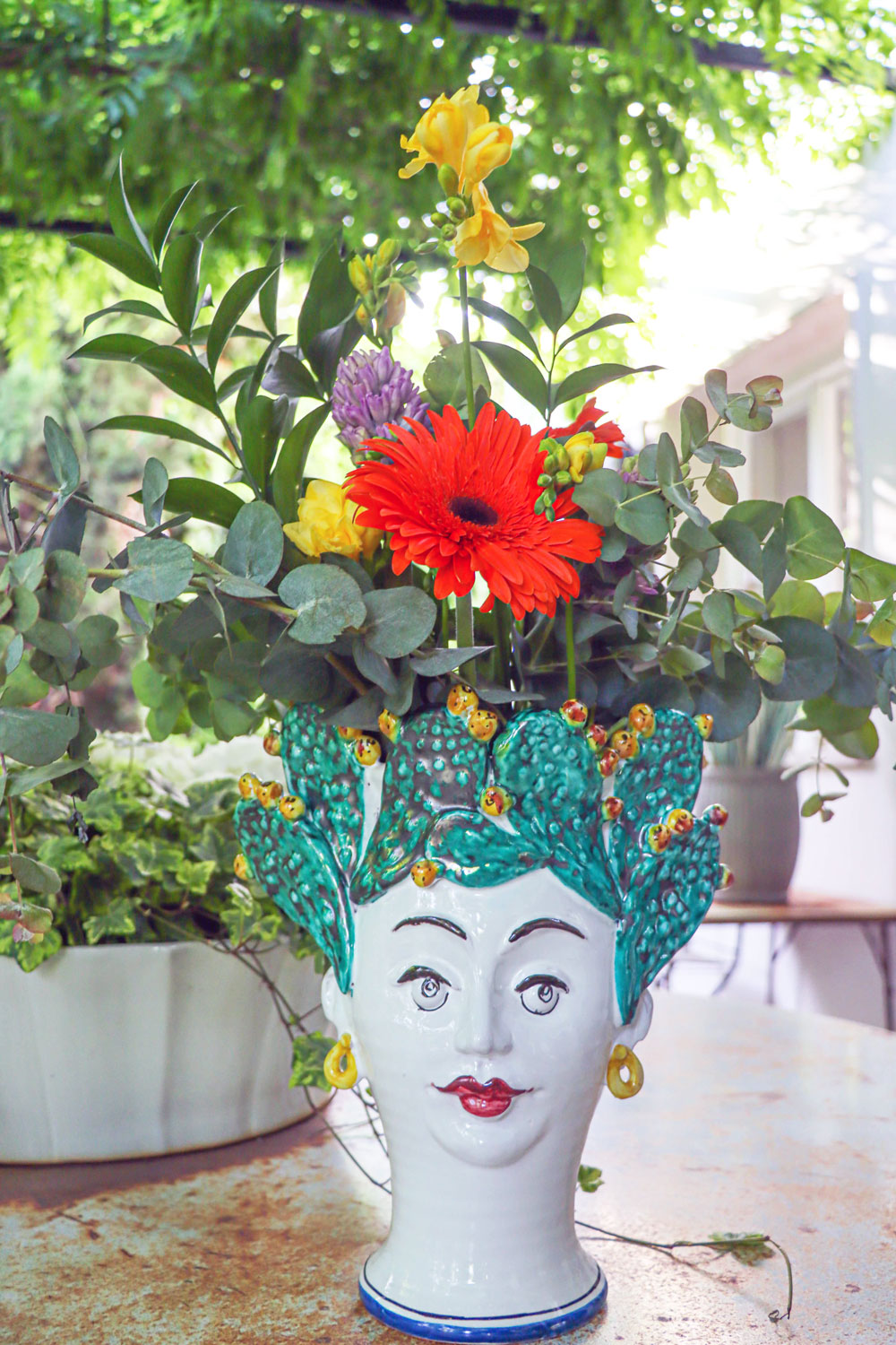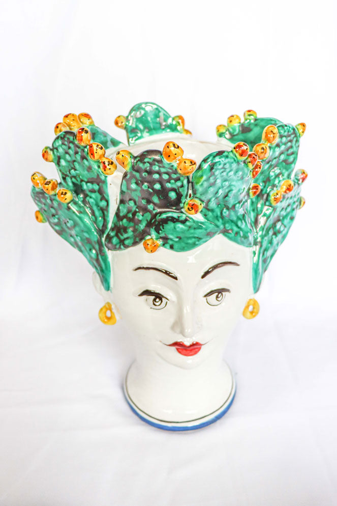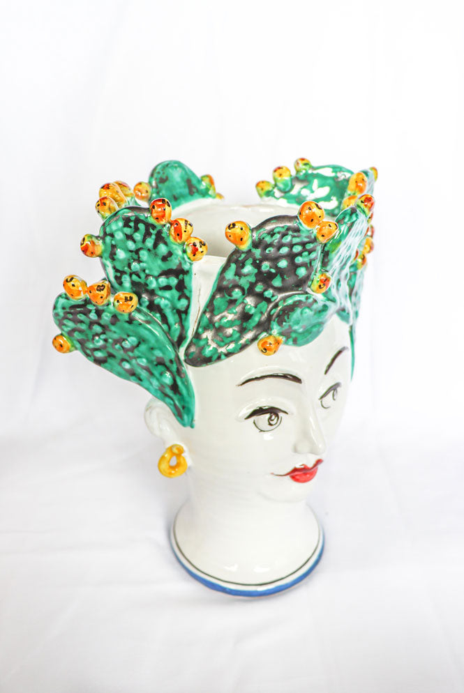 Cabeza de cerámica pintada a mano en forma de cactus. Una pieza única para la decoración de cualquier hogar o exterior. Apta para contener agua dentro.