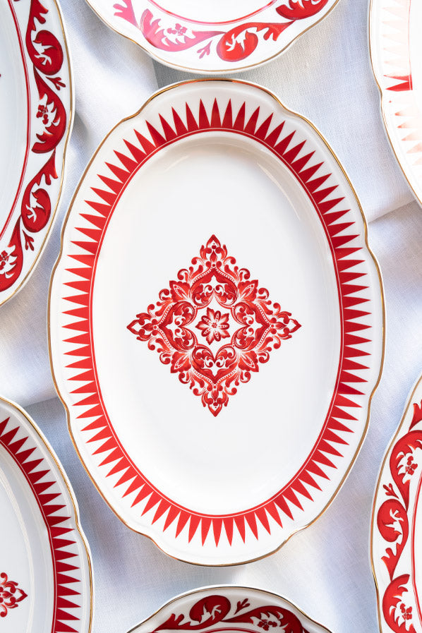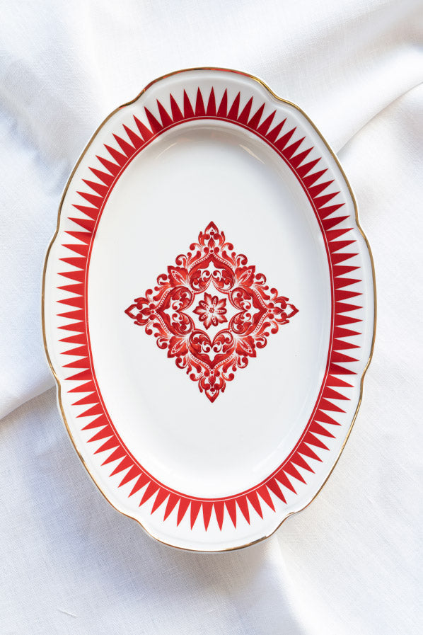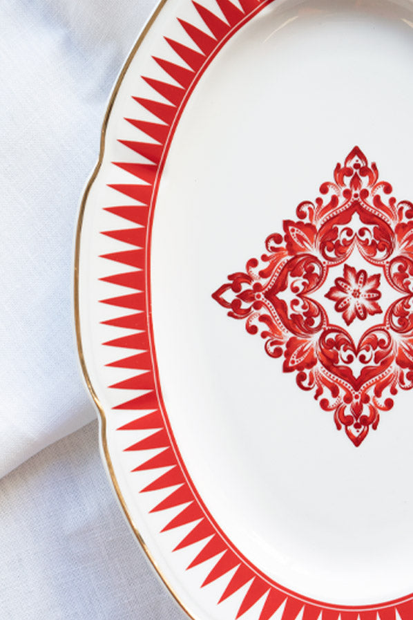 Fuente de porcelana diseñada por Eugenia&Sushita x Lorenzo Caprile. Diseño único de la Colección Mimi. Vajilla elegante con que cuenta con un fino borde dorado así como una flor en el centro del plato, acabada con un borde geométrico.