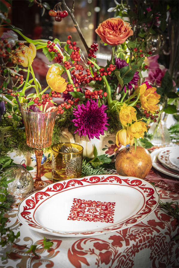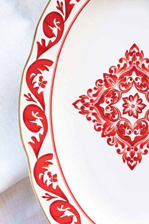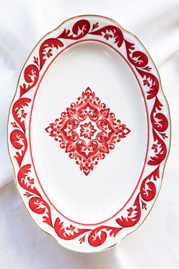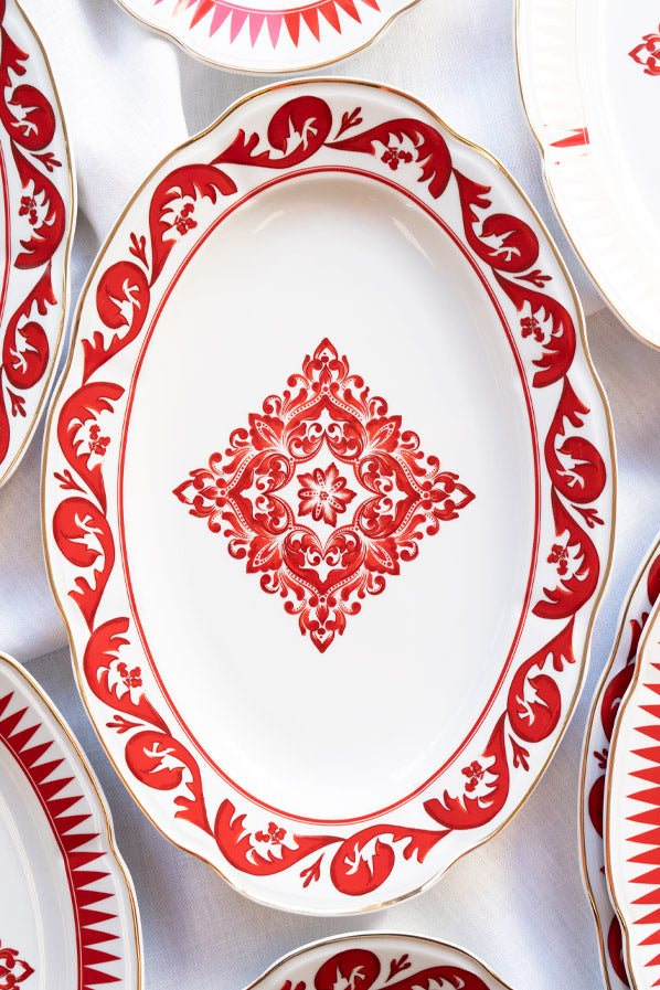 Fuente de porcelana diseñada por Eugenia&Sushita x Lorenzo Caprile. Diseño único de la Colección Mimi. Vajilla elegante con que cuenta con un fino borde dorado así como una flor en el centro del plato, acabada con un borde geométrico.