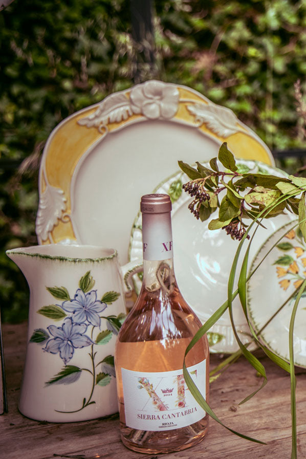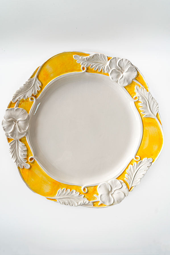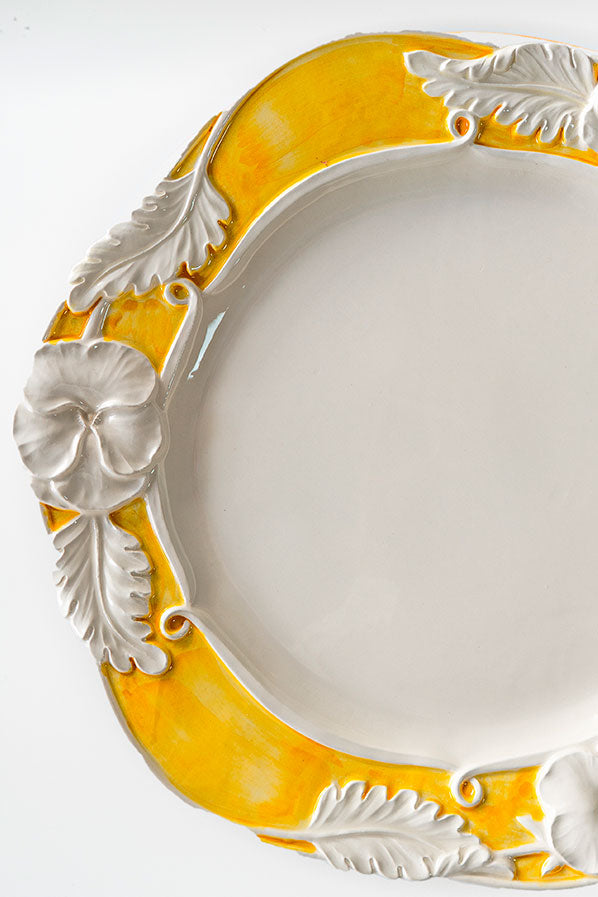 Fuente redonda con motivos florales y borde pintado a mano en amarillo. Pieza 100% artesanal.