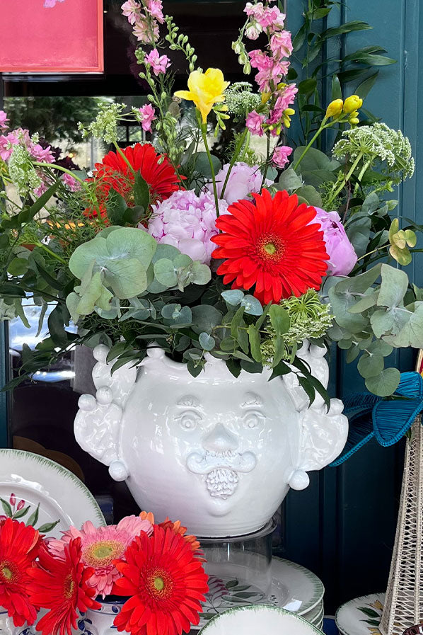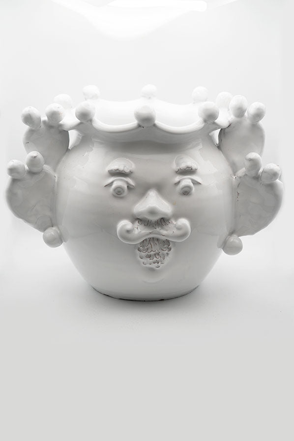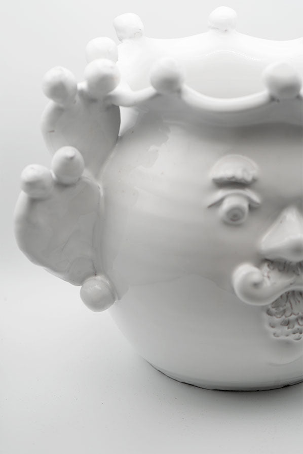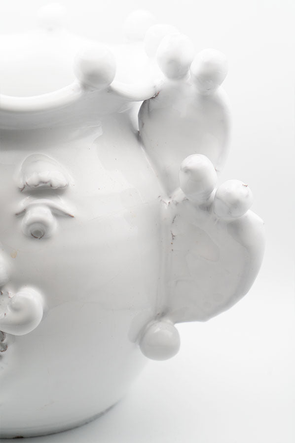 Jarrón de cerámica blanco de tamaño grande en forma de hombre con detalles laterales de cactus.