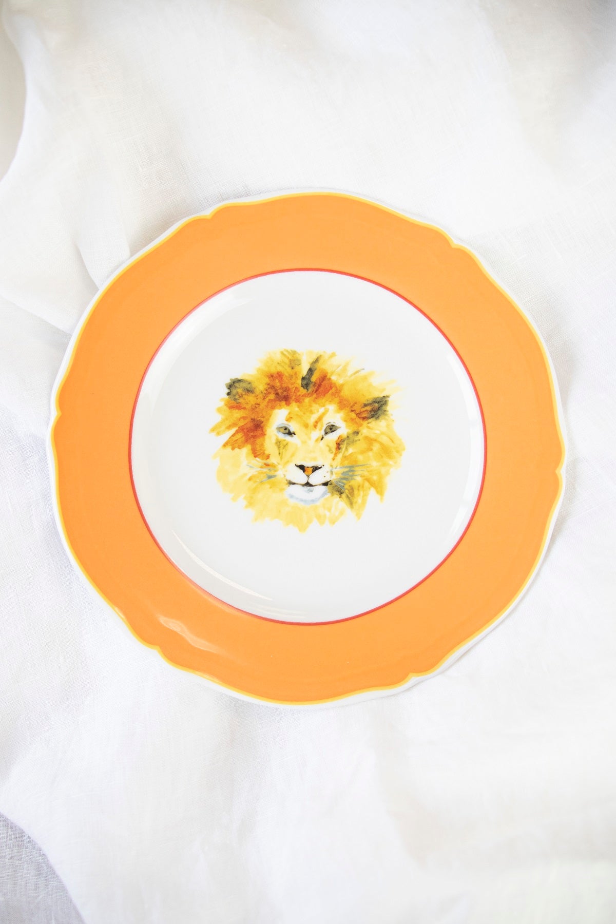Plato de porcelana diseñado por Eugenia Martínez de Irujo y Sushita con dibujo de león y un ancho borde naranja.