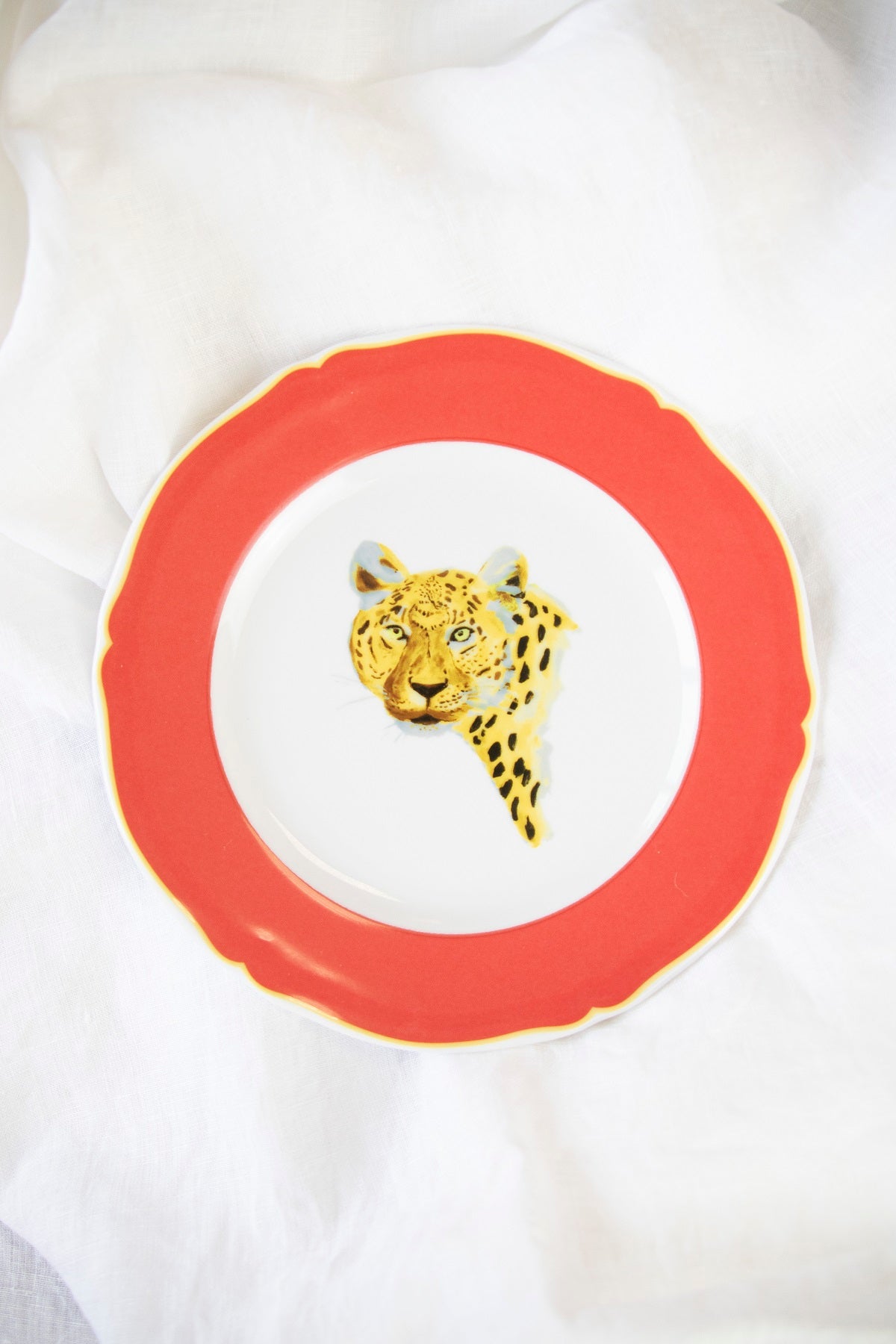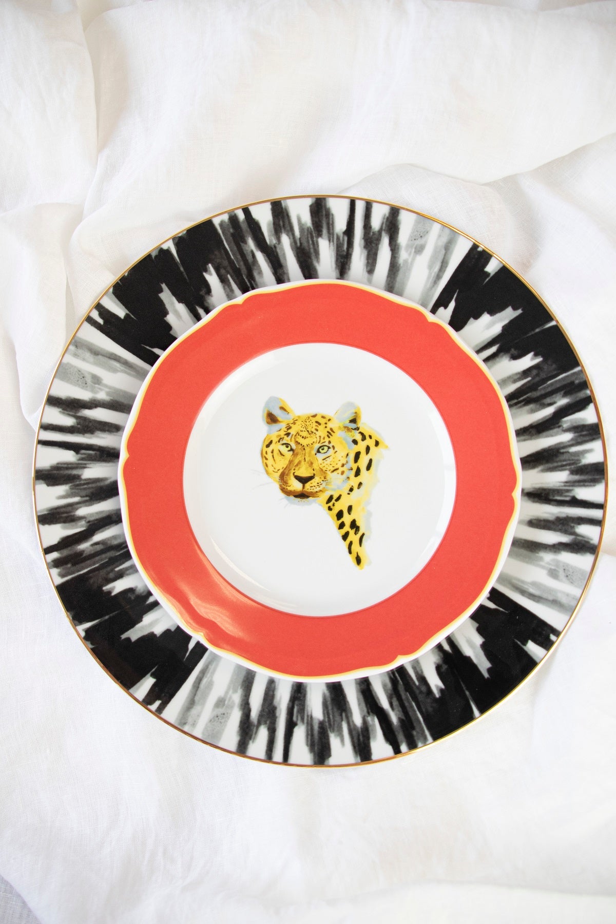 Plato de porcelana diseñado por Eugenia Martínez de Irujo y Sushita con dibujo de leopardo y un ancho borde rojo.