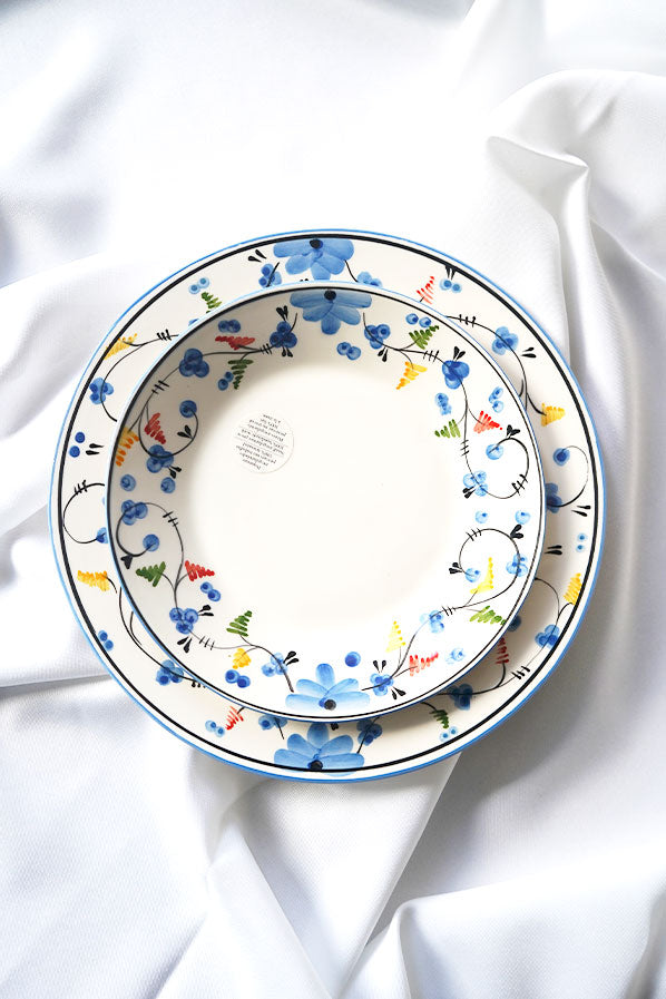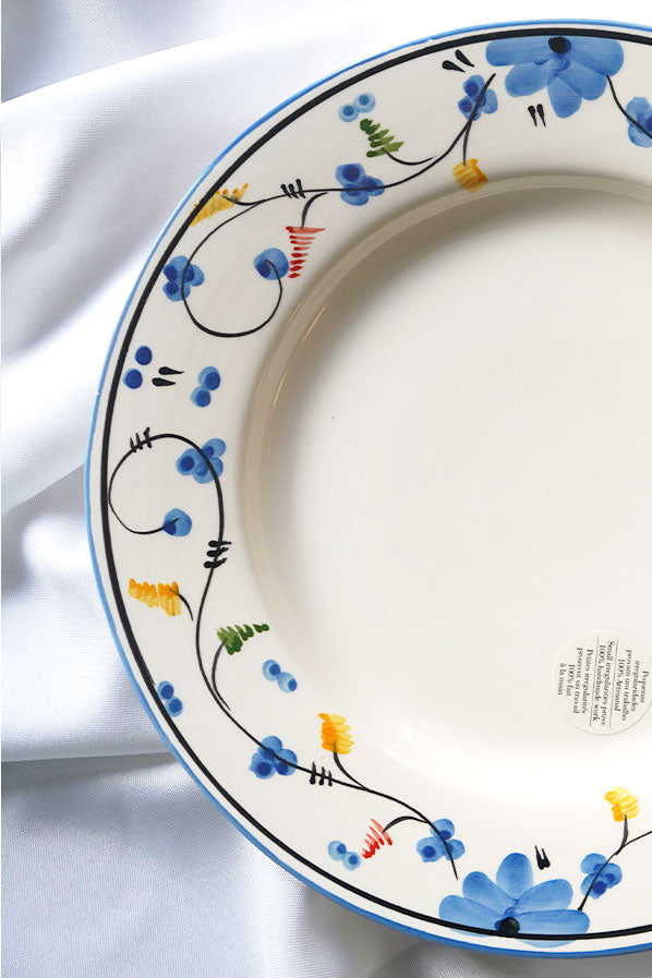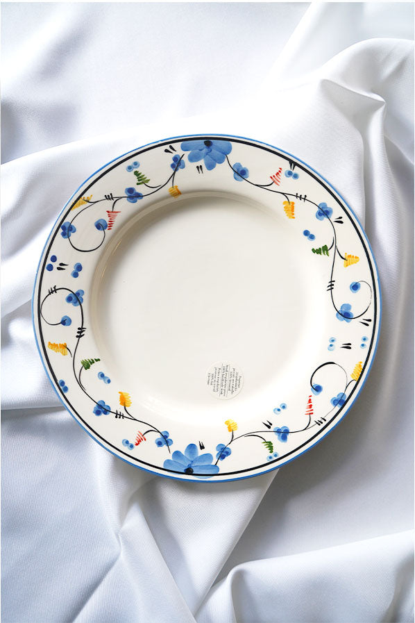 Plato llano pintado a mano con motivos florales acompañado con unas elegantes líneas finas. Borde pintado en color azul.