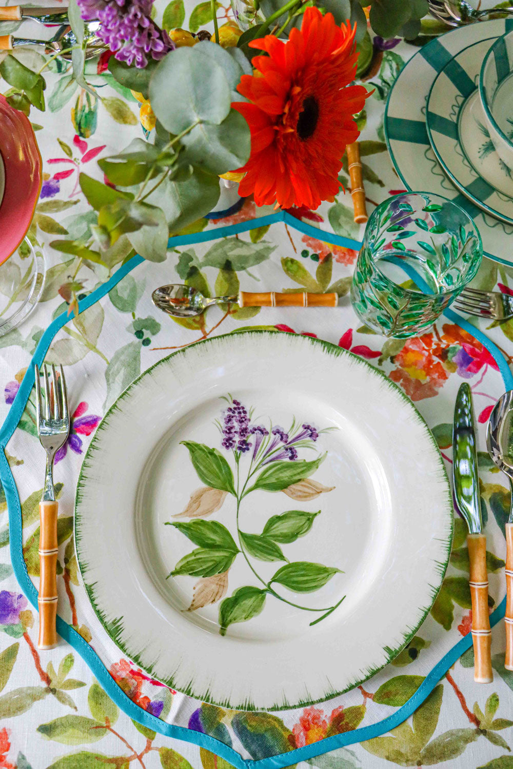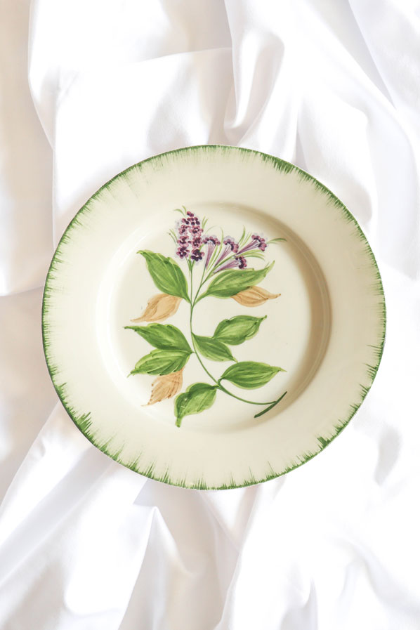 Plato llano pintado a mano con dibujo central de lavanda y borde verde irregular. Toda la colección botánica está pintada a mano y por ello su forma y color pueden variar de una pieza a otra, haciendo a cada una de ellas única.