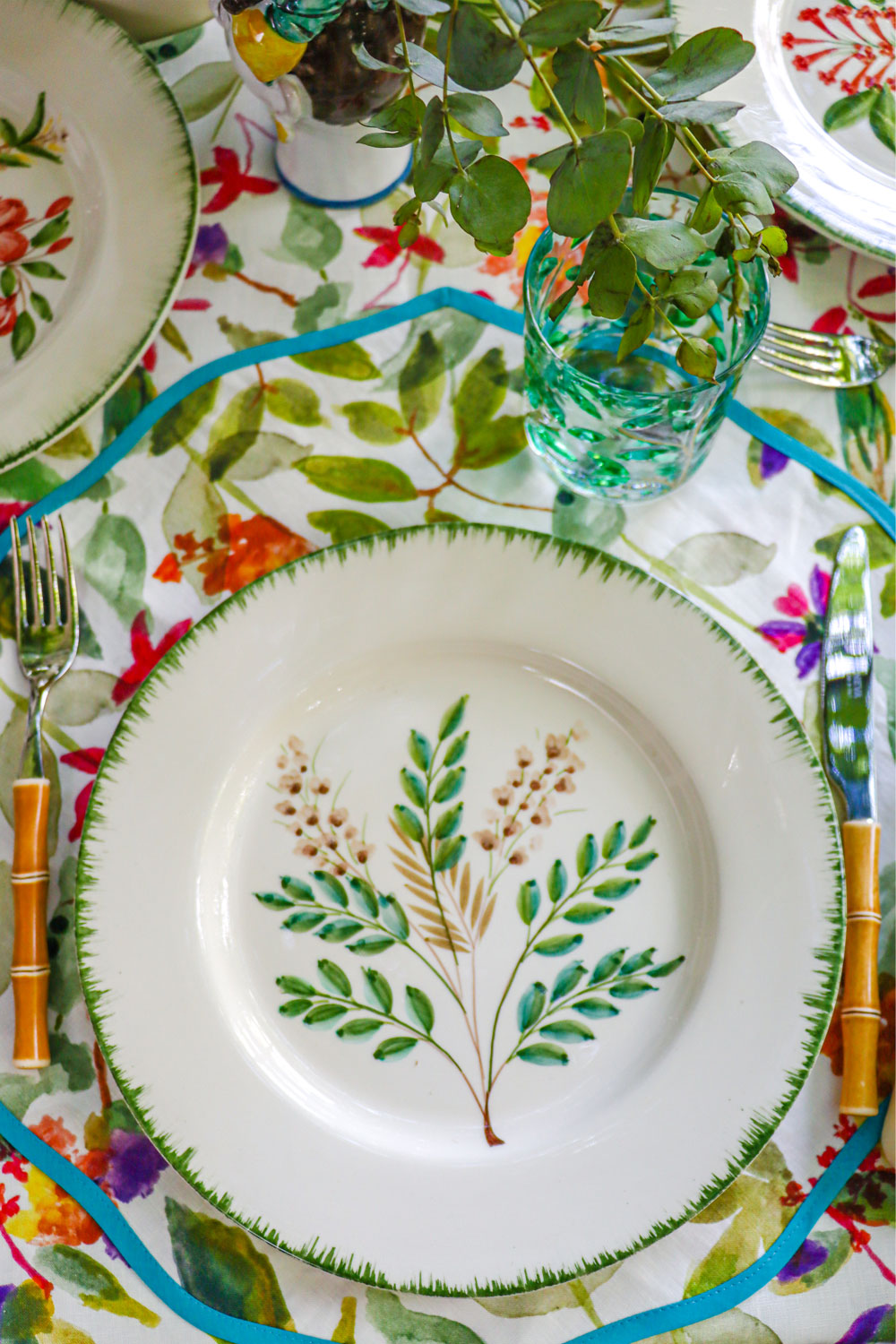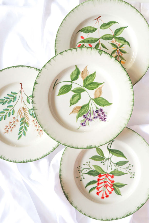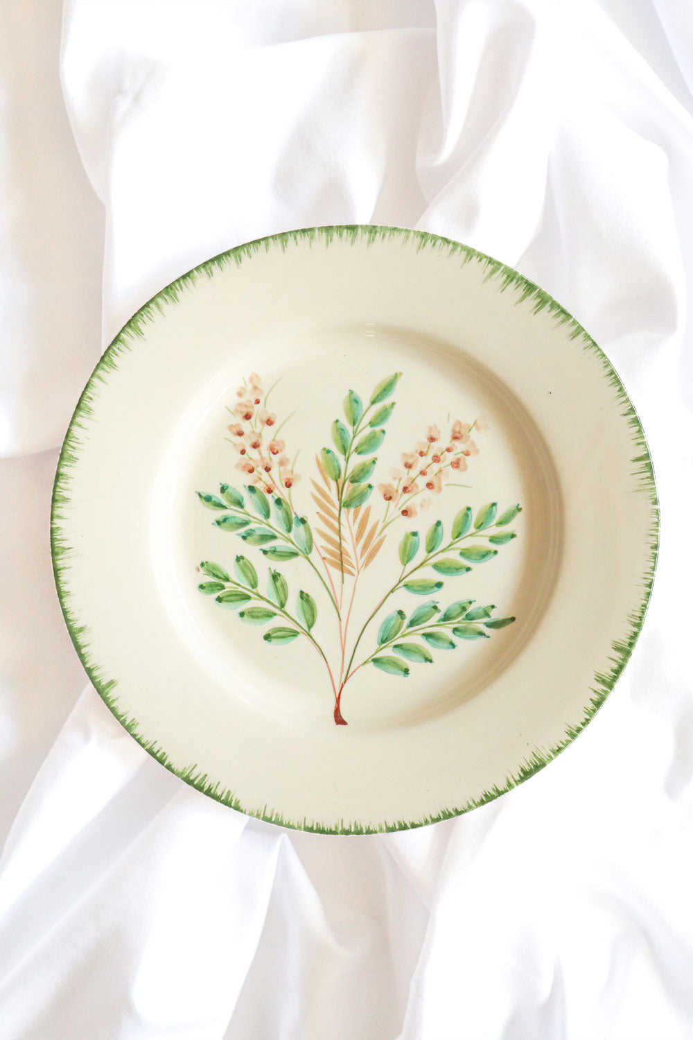 Plato llano pintado a mano con dibujo central de espiga y borde verde irregular. Toda la colección botánica está pintada a mano y por ello su forma y color pueden variar de una pieza a otra, haciendo a cada una de ellas única.