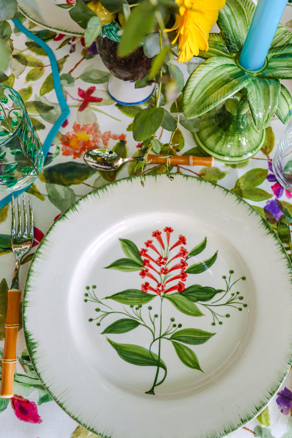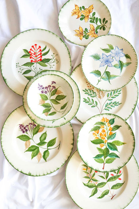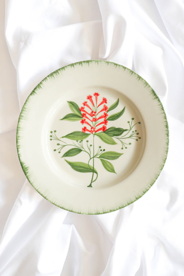 Plato llano pintado a mano con dibujo central de alpinia y borde verde irregular. Toda la colección botánica está pintada a mano y por ello su forma y color pueden variar de una pieza a otra, haciendo a cada una de ellas única.