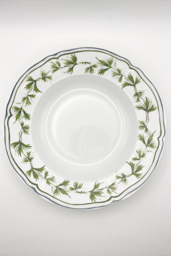Plato hondo de nuestra colección de hojas verdes, con bordes irregulares que añaden un toque de autenticidad artesanal, este diseño único en tonos verdes y una ligera línea azul en el borde
