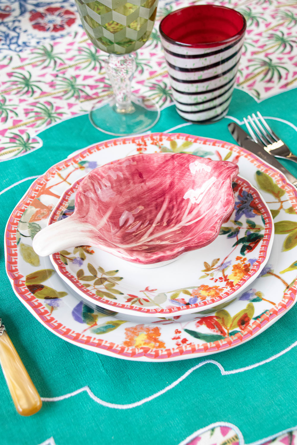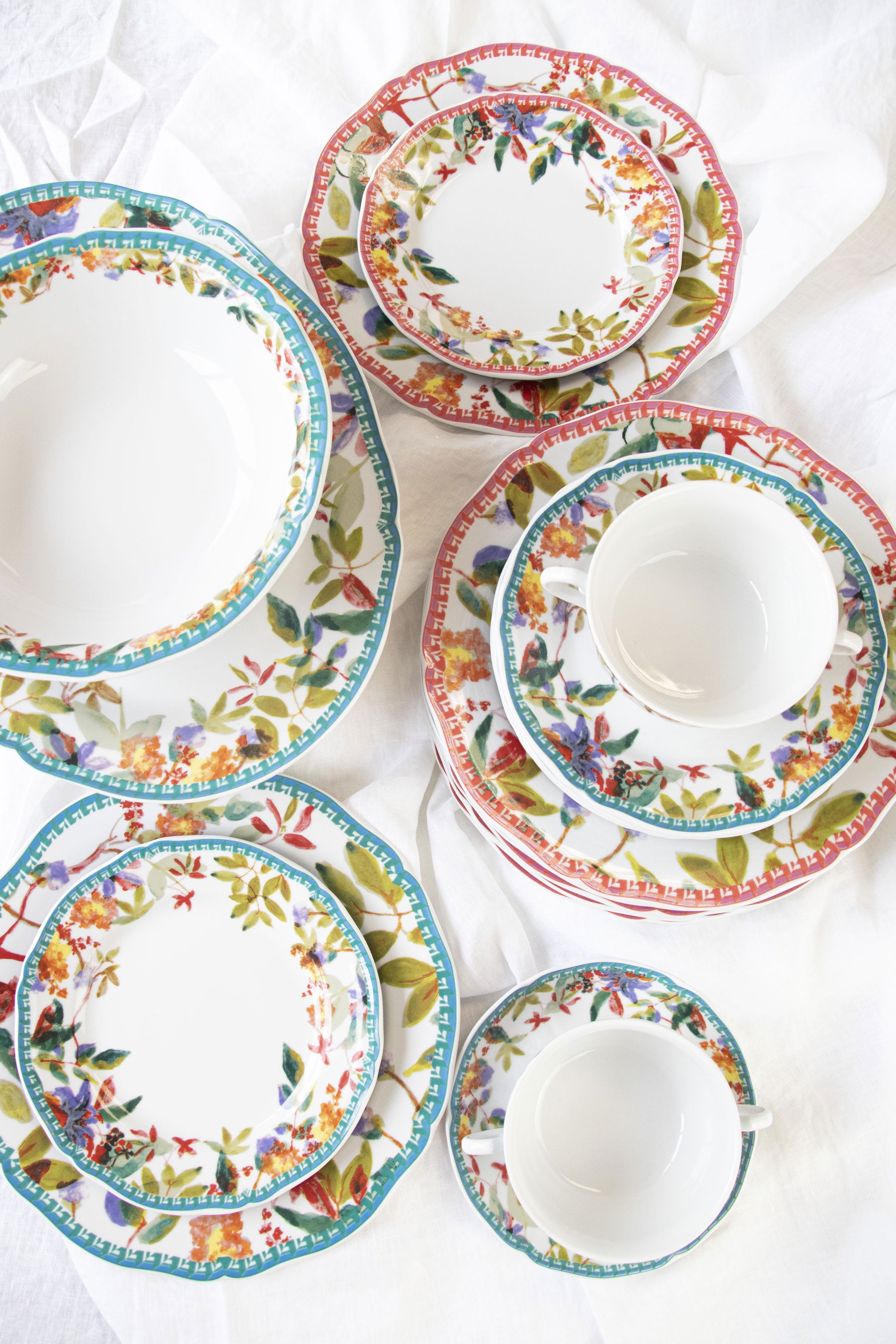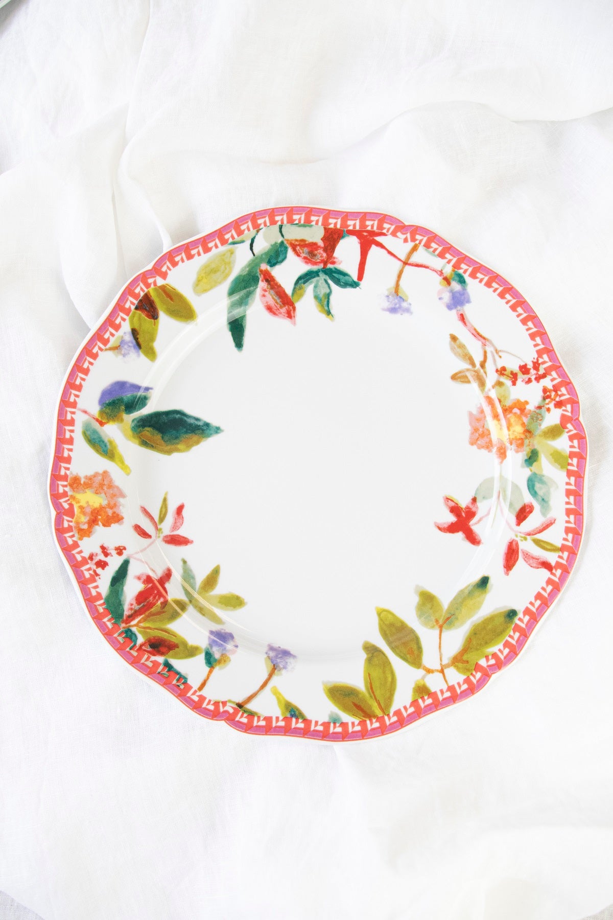 Plato de porcelana diseñado por Eugenia Martínez de Irujo y Sushita con dibujo de flores y borde rosa.