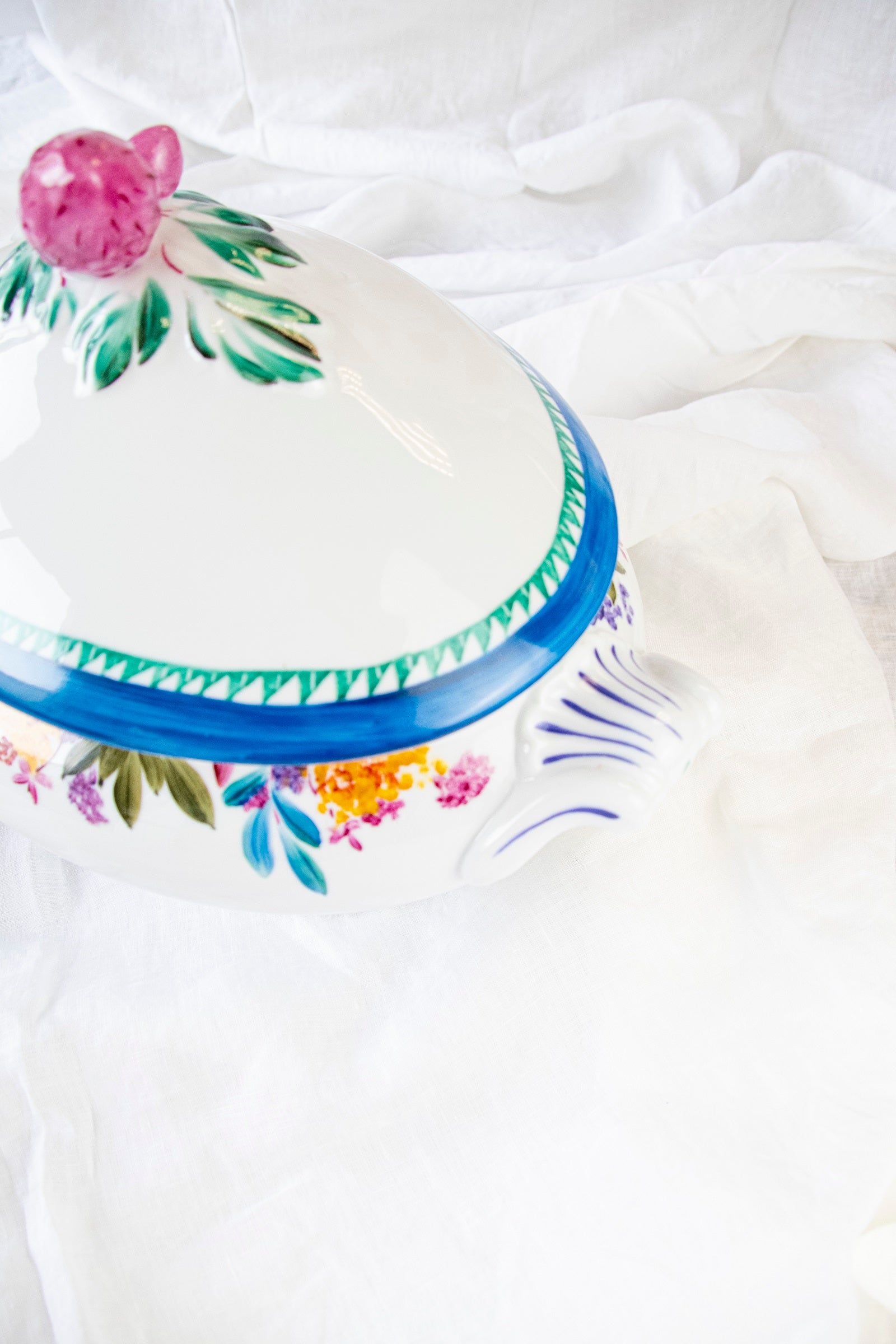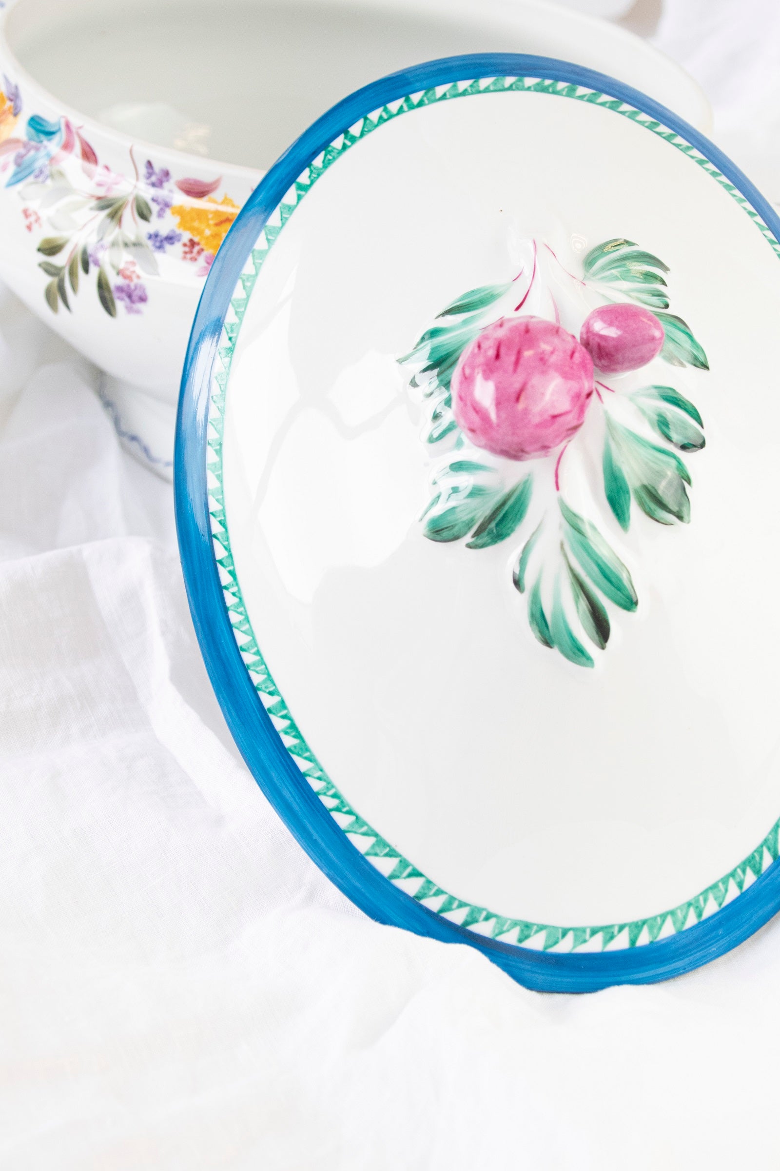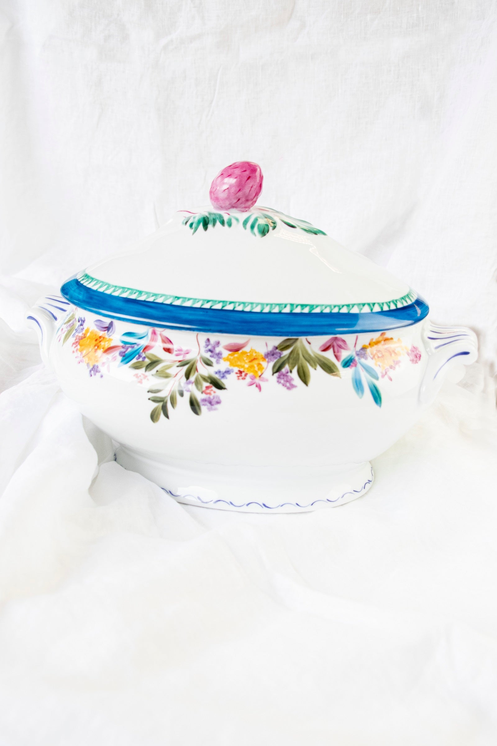 Sopera de porcelana pintada a mano diseñado por Eugenia Martínez de Irujo y Sushita con dibujo de flores y borde azul.