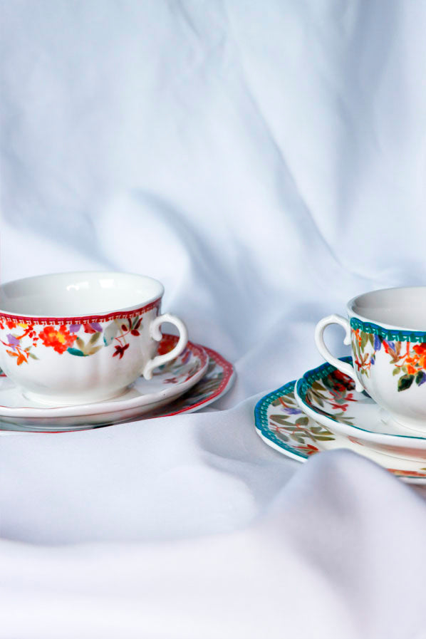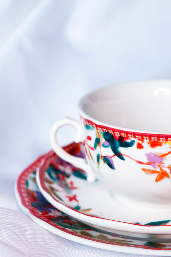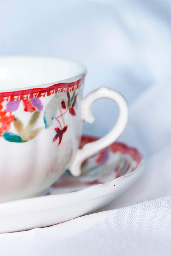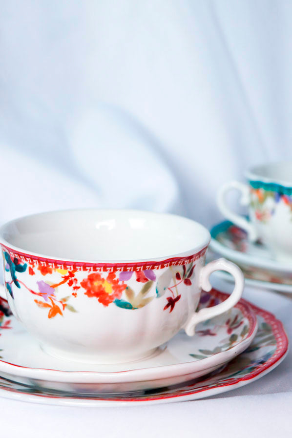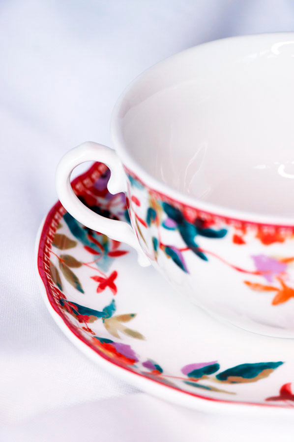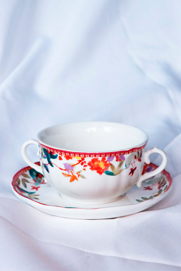 Taza de consomé y plato de porcelana diseñado por Eugenia Martínez de Irujo y Sushita con dibujo de flores y borde rojo.