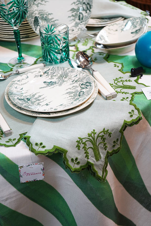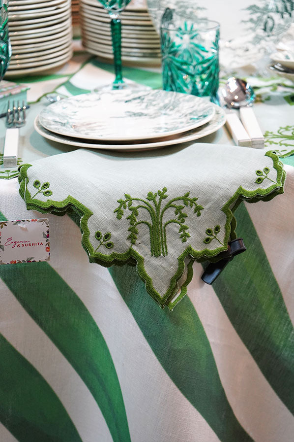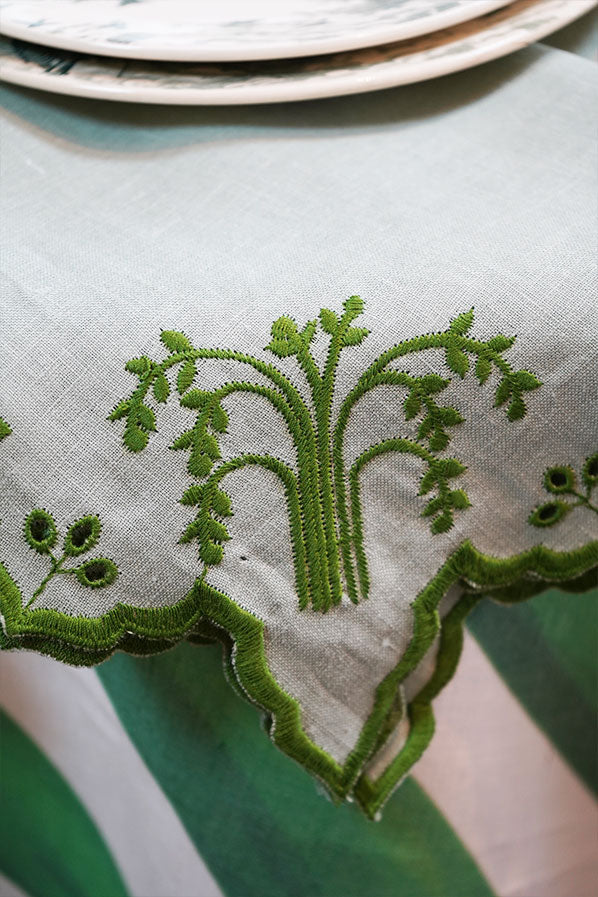 Servilleta de lino en color verde agua con bordado artesanal en verde manzana.