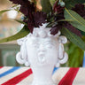 Jarrón de cerámica blanco de tamaño pequeño en forma de mujer con detalles laterales.