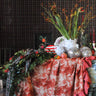Mantel de 100% de lino con dibujo floral y dos volantes de color rojo.