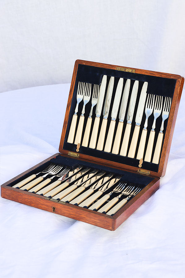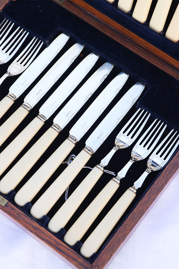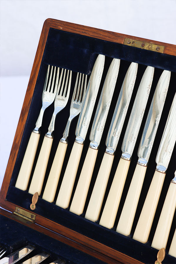 Descubre la belleza atemporal con esta exclusiva cubertería de 24 piezas, fabricada en Inglaterra en la década de 1920. Cada pieza está cuidadosamente bañada en plata, lo que le confiere un brillo y elegancia incomparable, mientras que el acabado en marfil aporta un toque de sofisticación y distinción.