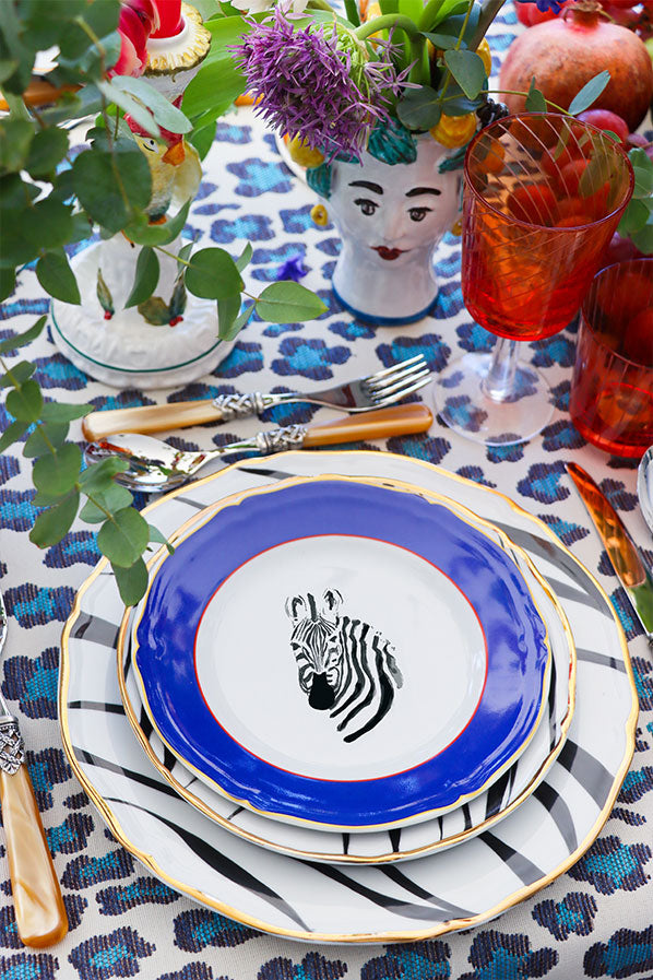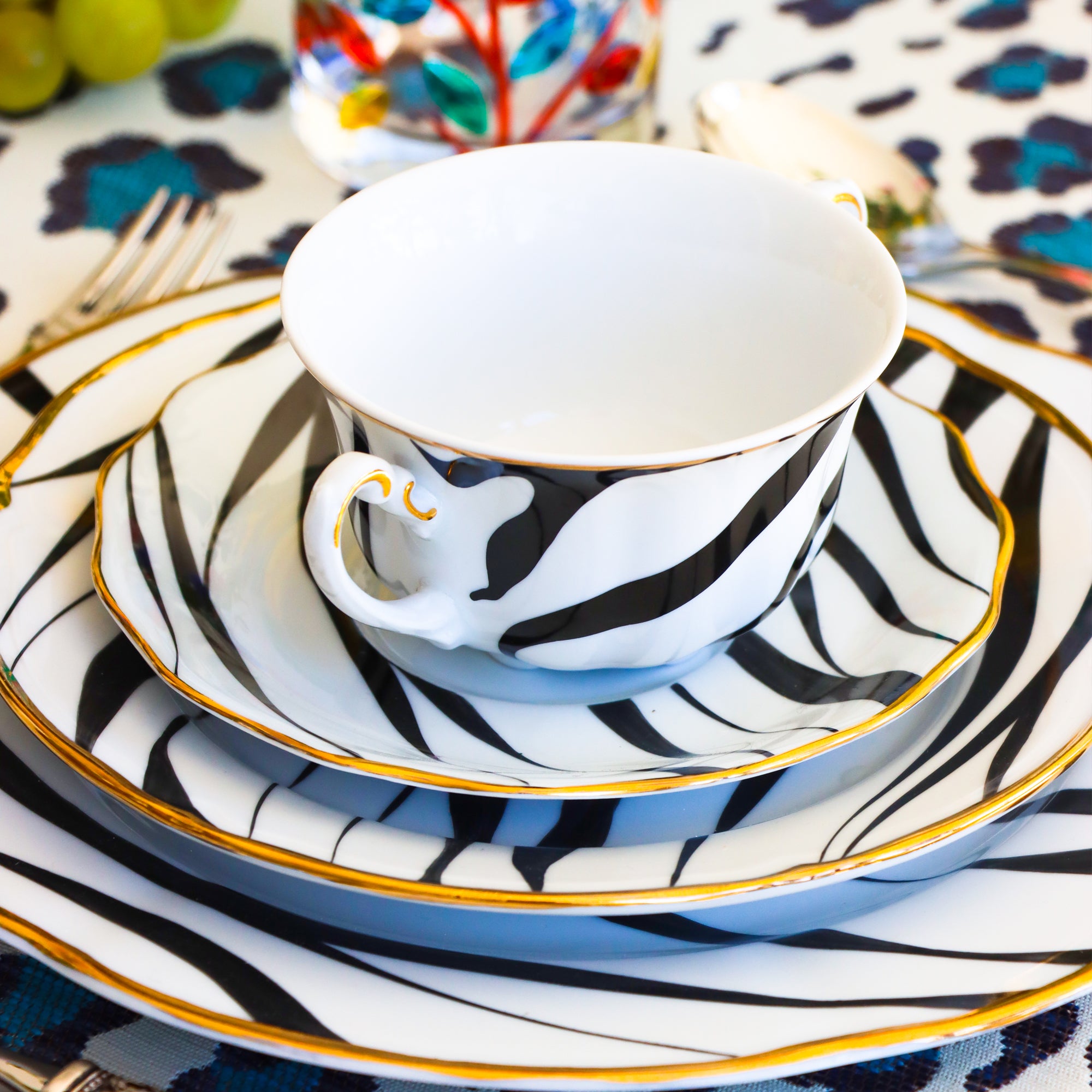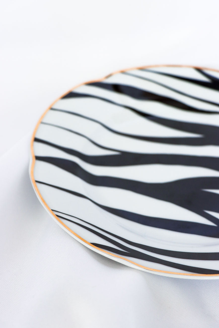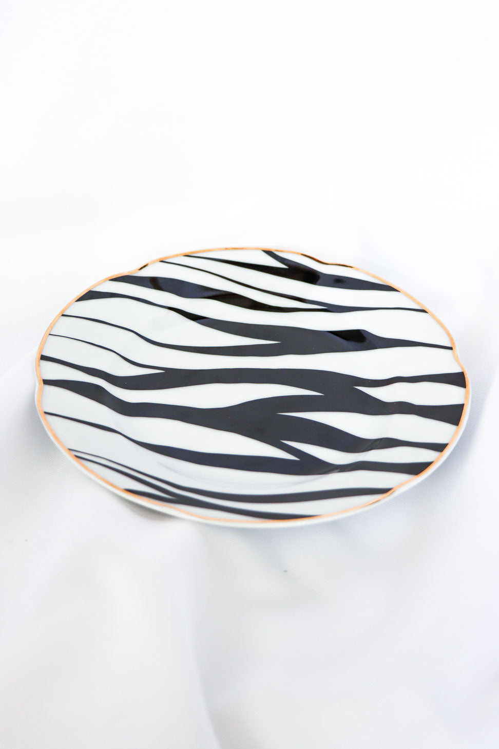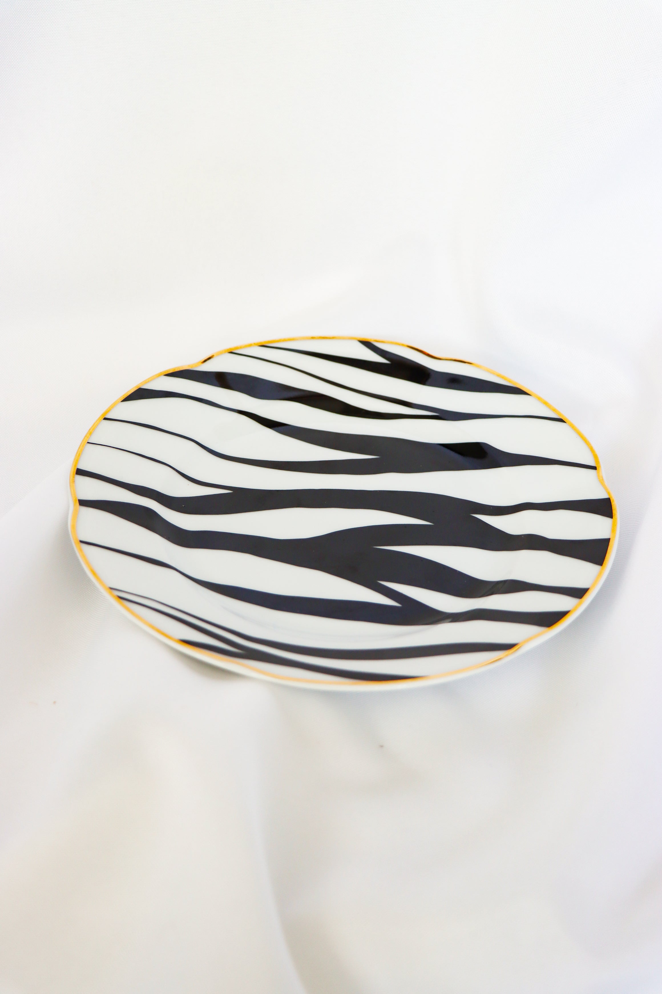 Plato de porcelana con líneas irregulares en blanco y negro inspirado en el pattern de Cebra de las obras de Eugenia Martínez de Irujo. Vajilla elegante que cuenta con un fino borde dorado.