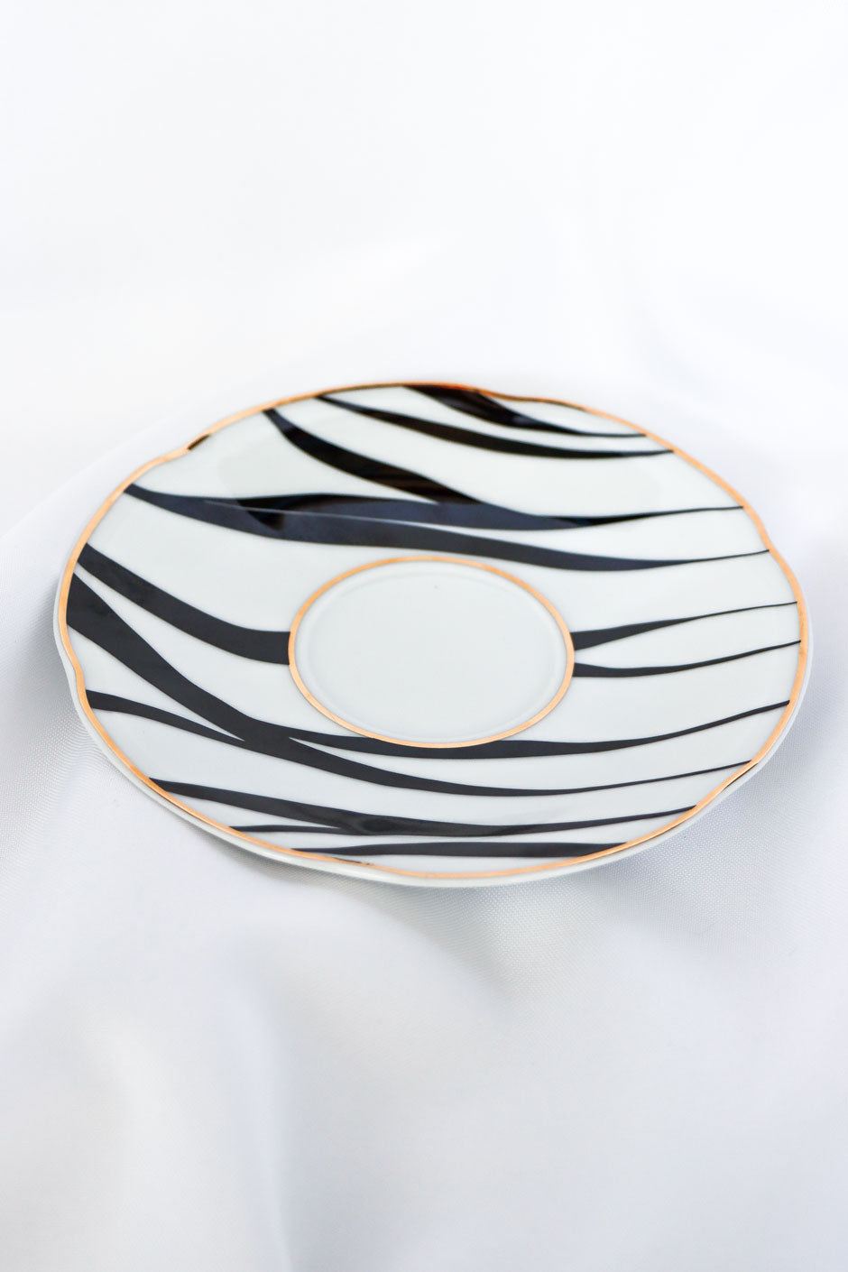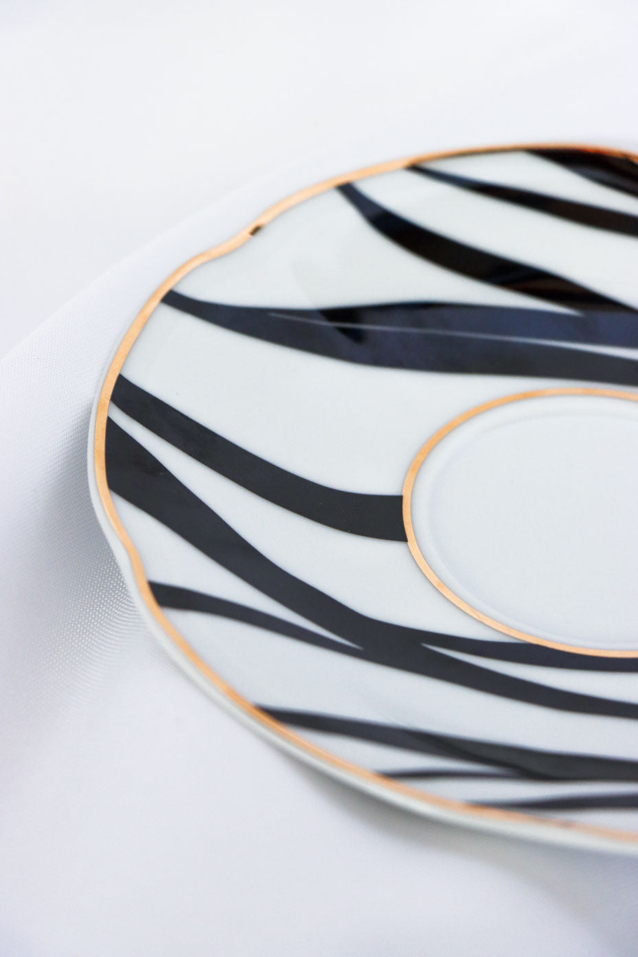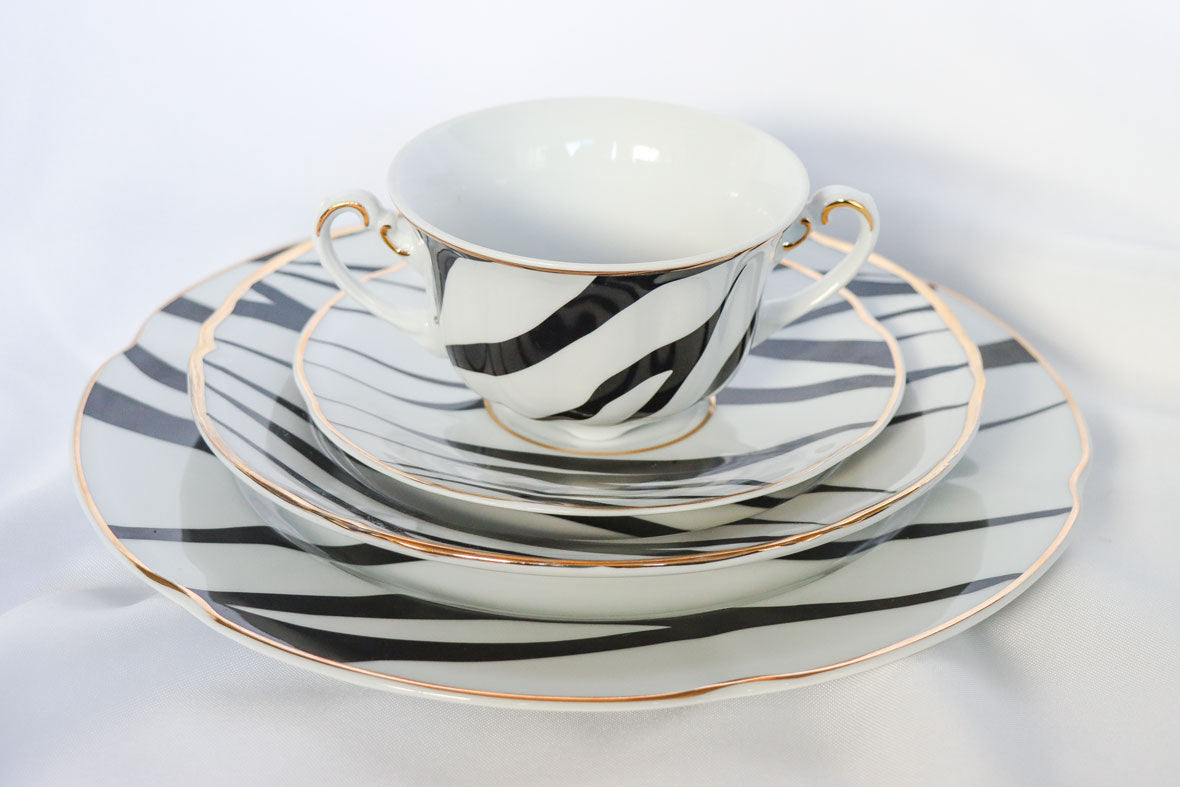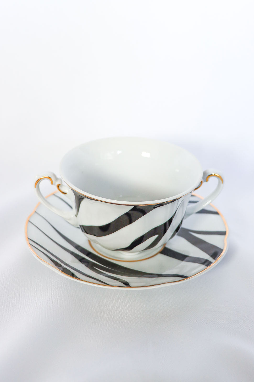 Taza de consomé junto con su plato de porcelana con líneas irregulares en blanco y negro inspirado en el pattern de Cebra de las obras de Eugenia Martínez de Irujo. Vajilla elegante que cuenta con un fino borde dorado.