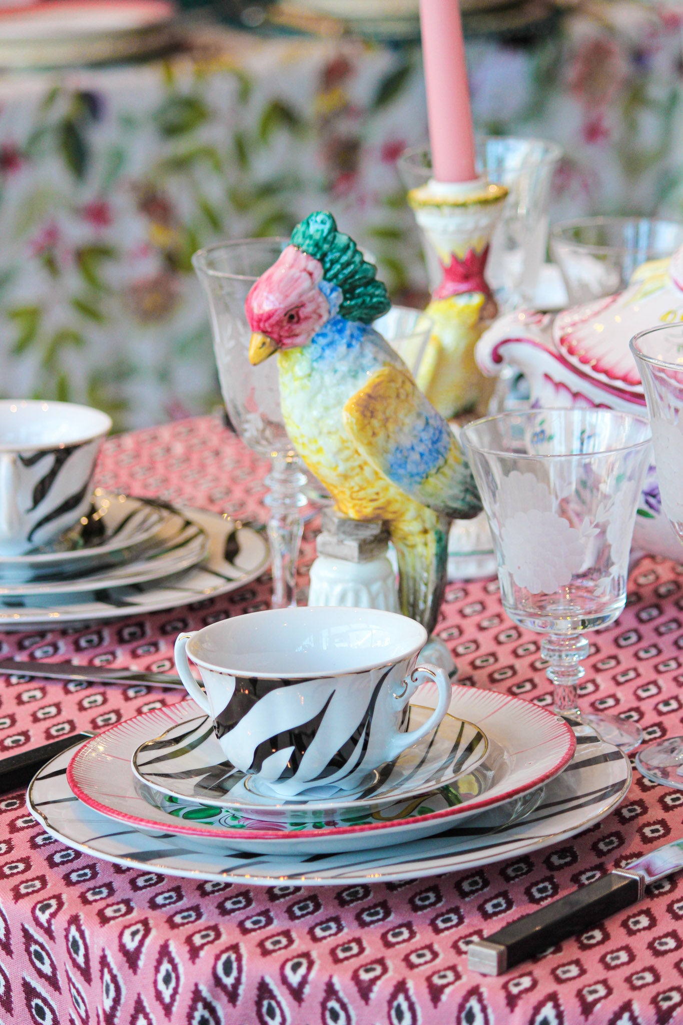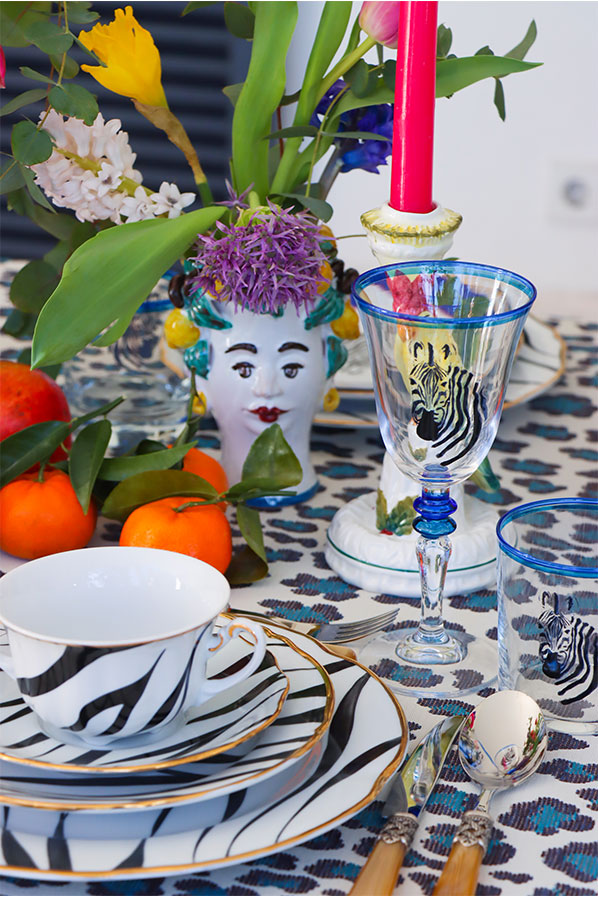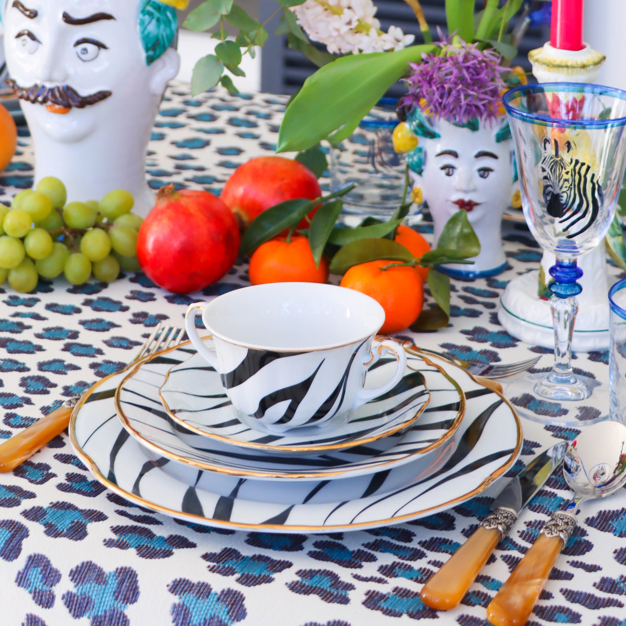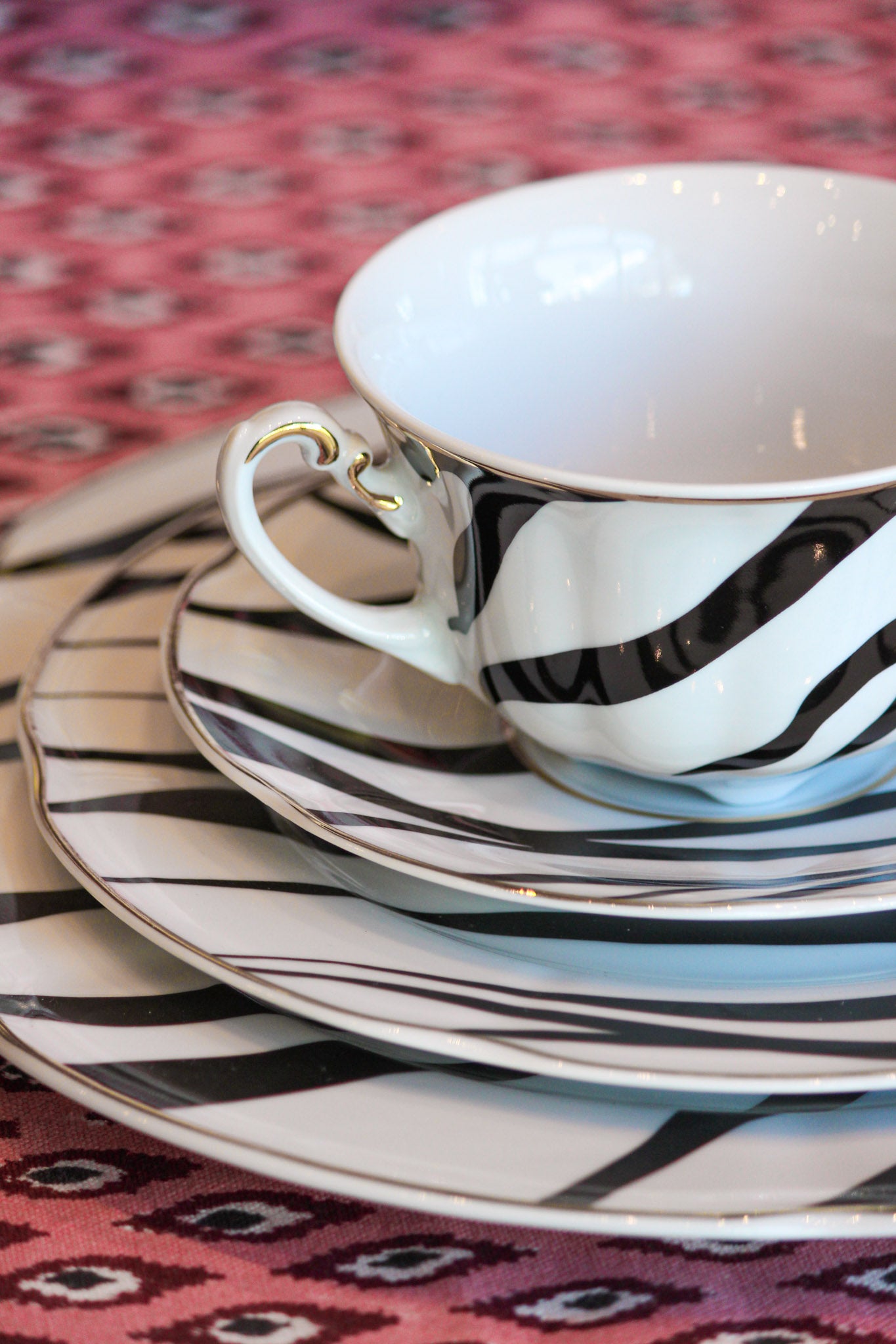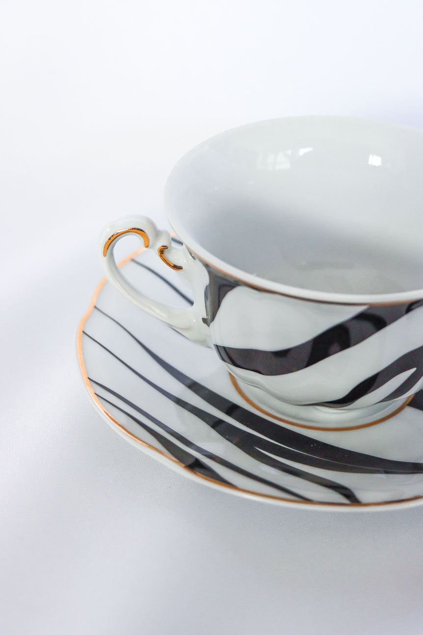 Taza de consomé junto con su plato de porcelana con líneas irregulares en blanco y negro inspirado en el pattern de Cebra de las obras de Eugenia Martínez de Irujo. Vajilla elegante que cuenta con un fino borde dorado.