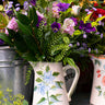 Jarra con Lirio, 100% artesanal, con asa acabada en pico y borde irregular. Toda la colección botánica está pintada a mano y por ello su forma y color pueden variar de una pieza a otra, haciendo a cada una de ellas única.