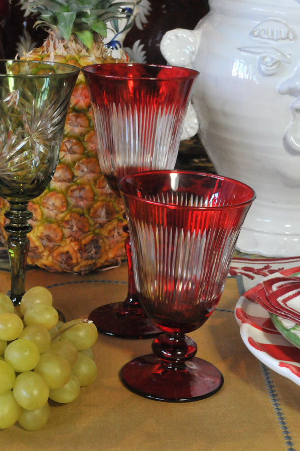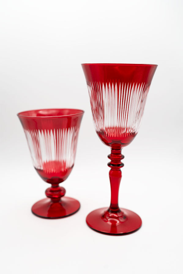 Copa en color rojo vibrante, delicadamente tallada a mano para resaltar su brillo y textura. Su diseño elegante combina tradición y modernidad, convirtiéndola en la pieza ideal para brindar en cenas familiares, celebraciones especiales o como regalo único.