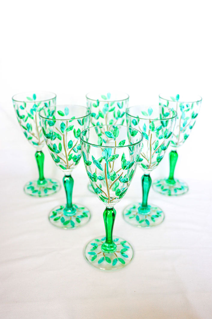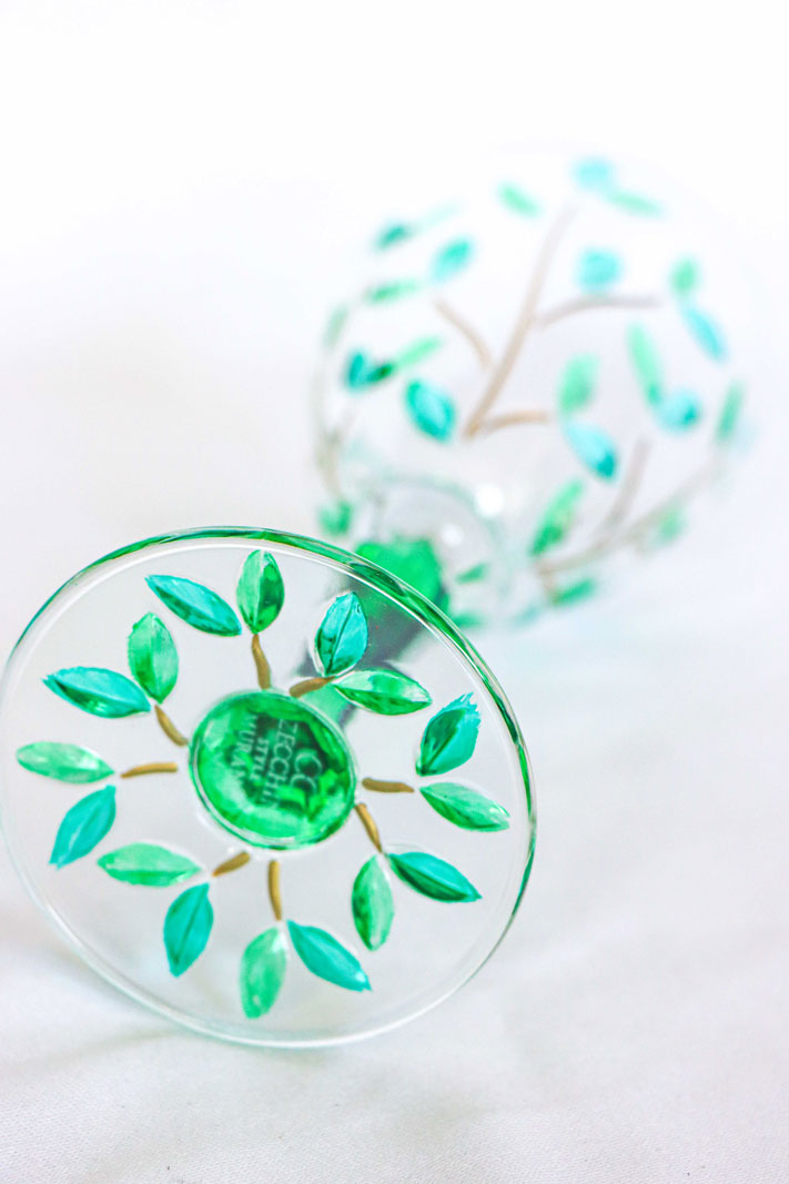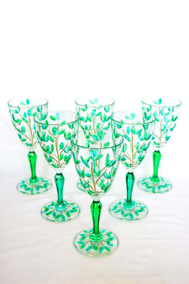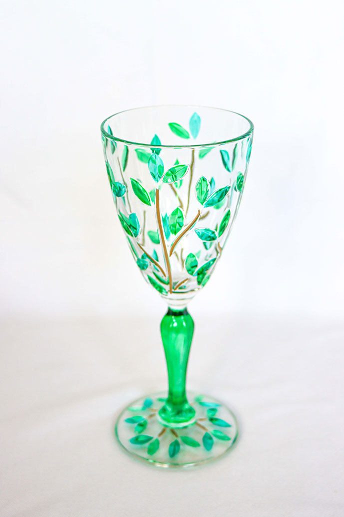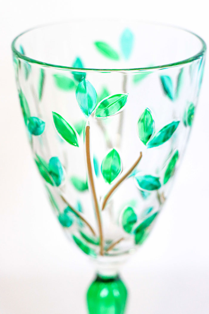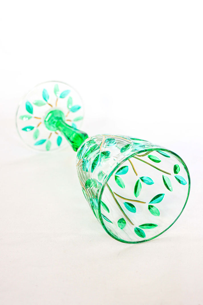 Copa tallada con decoración hojas en tonos verdes. Hecho artesanalmente en Venecia.