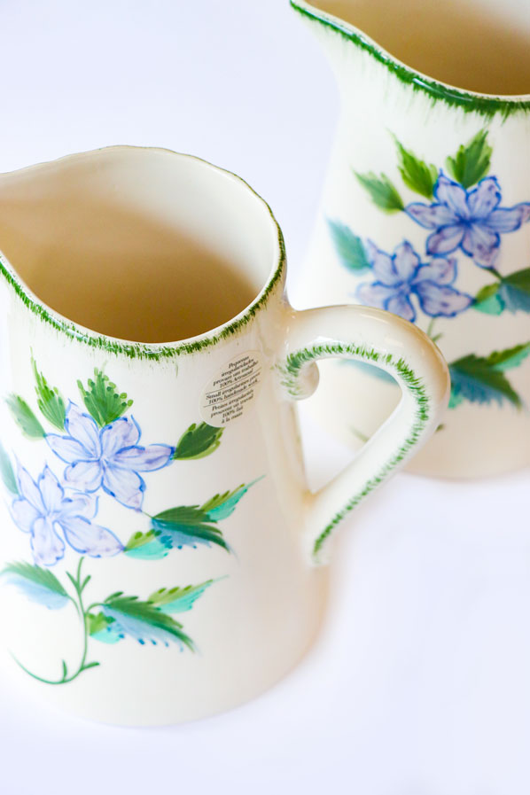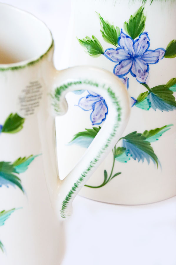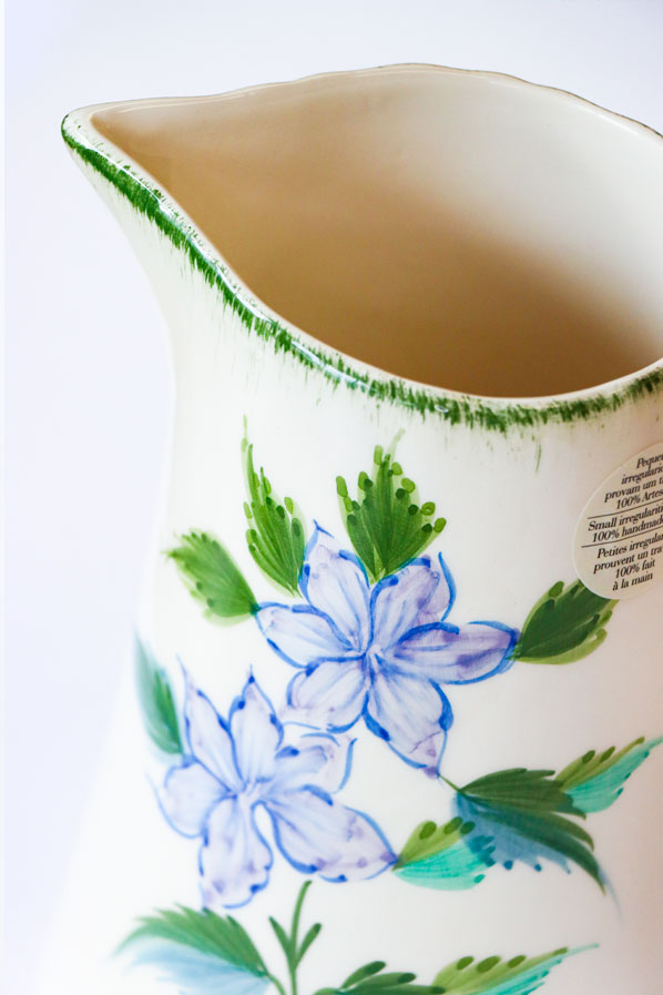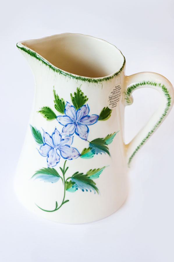 Jarra con Lirio, 100% artesanal, con asa acabada en pico y borde irregular. Toda la colección botánica está pintada a mano y por ello su forma y color pueden variar de una pieza a otra, haciendo a cada una de ellas única.