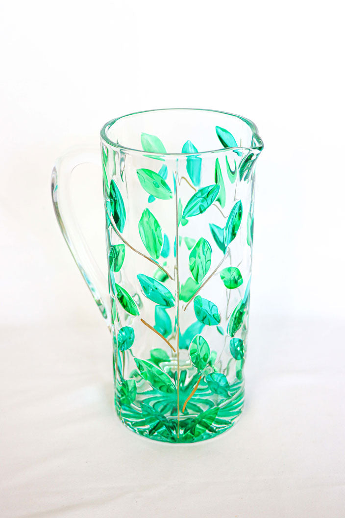 Jarra de cristal hecha artesanalmente en Venecia. Decoración tallada de hojas de colores.