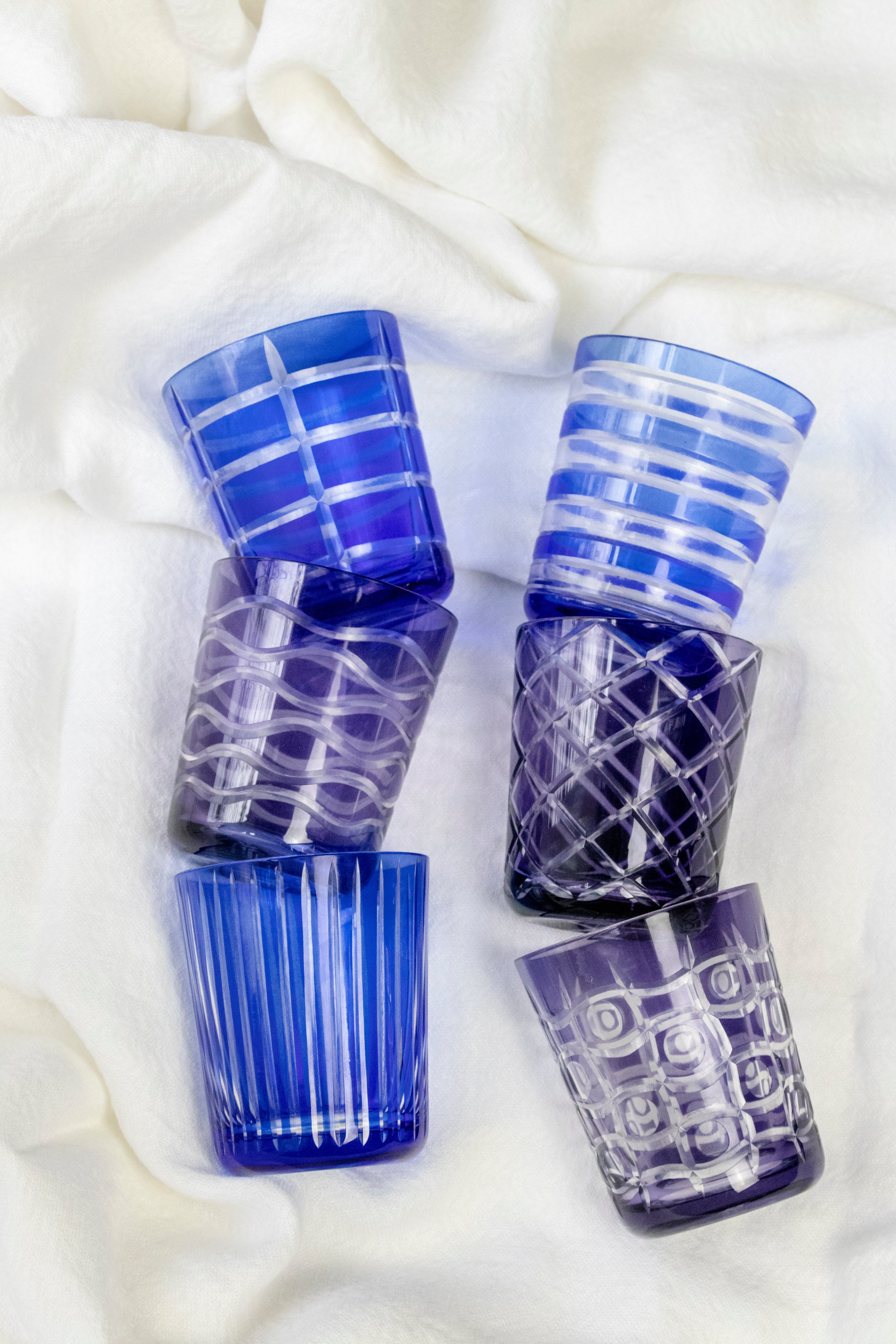 Juego 6 vasos exclusivos en cristal soplado a mano. Diferentes tonos con dbujos geométricos tallados.